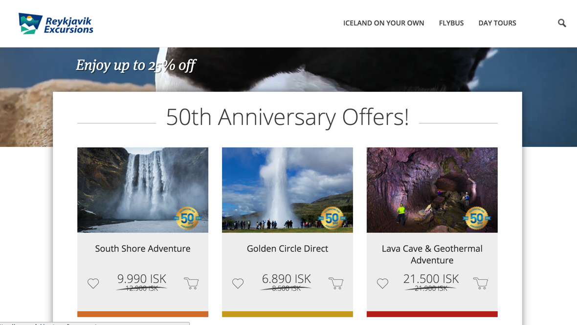 例如:Reykjavik Excursions 網站:顯示折扣價與劃掉的原價,提升使用者對商品價值的感知。