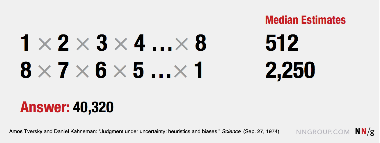 研究內容:心理學家 Amos Tversky 和 Daniel Kahneman 讓參與者在 5 秒內估算兩個數學題: