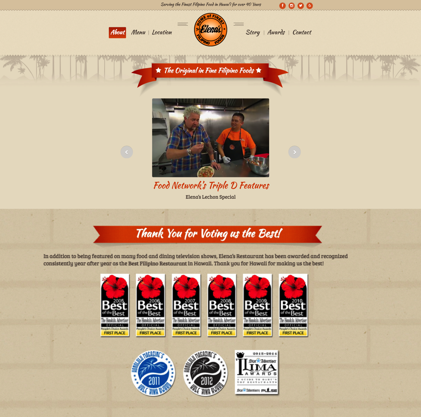 Elena's Filipino Restaurant:利用名人(如Guy Fieri)的背書以及本地美食獎項提升權威性。