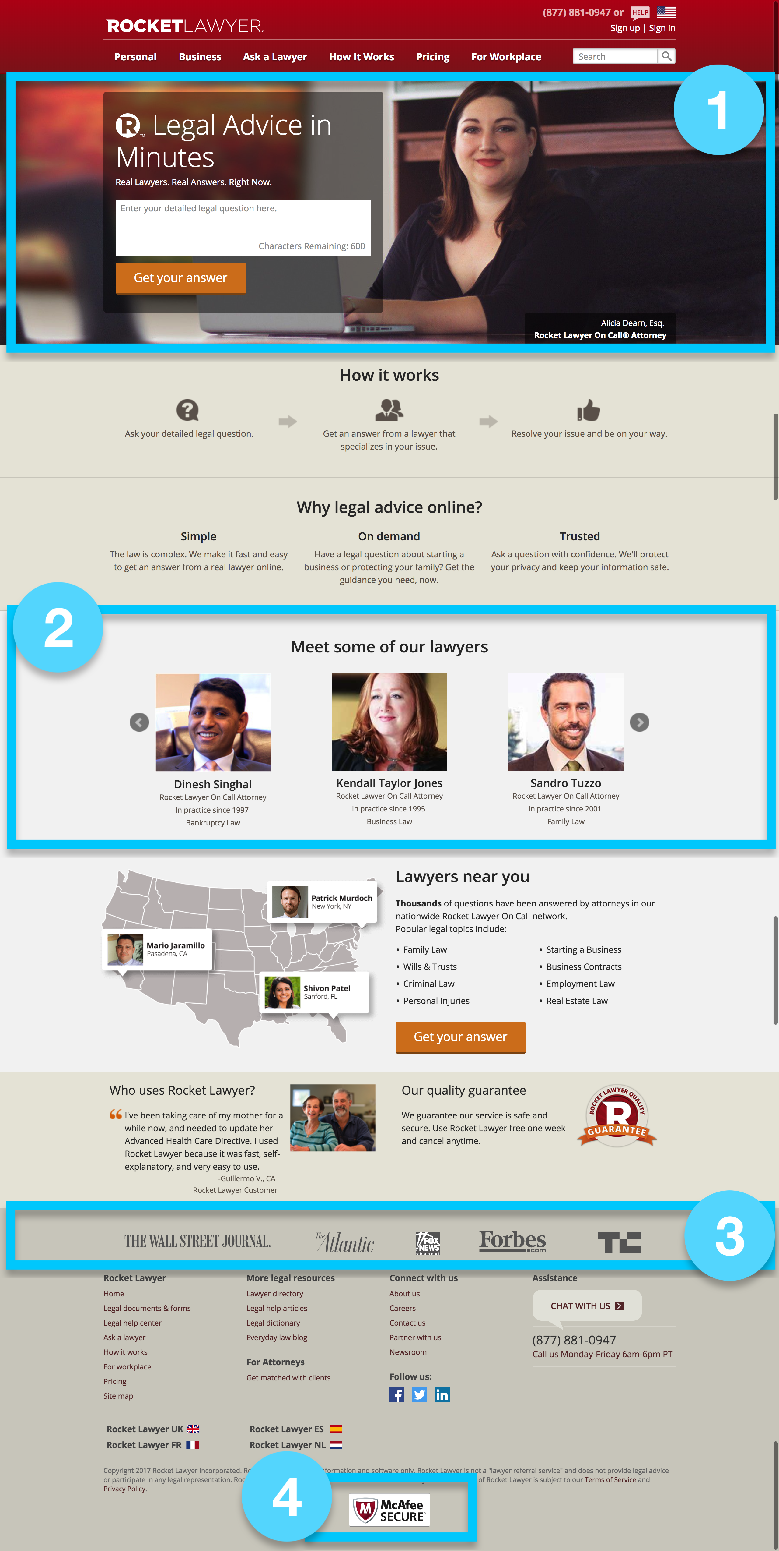 RocketLawyer.com:透過展示律師照片、知名媒體報道和安全標誌(如McAfee)來建立信任。