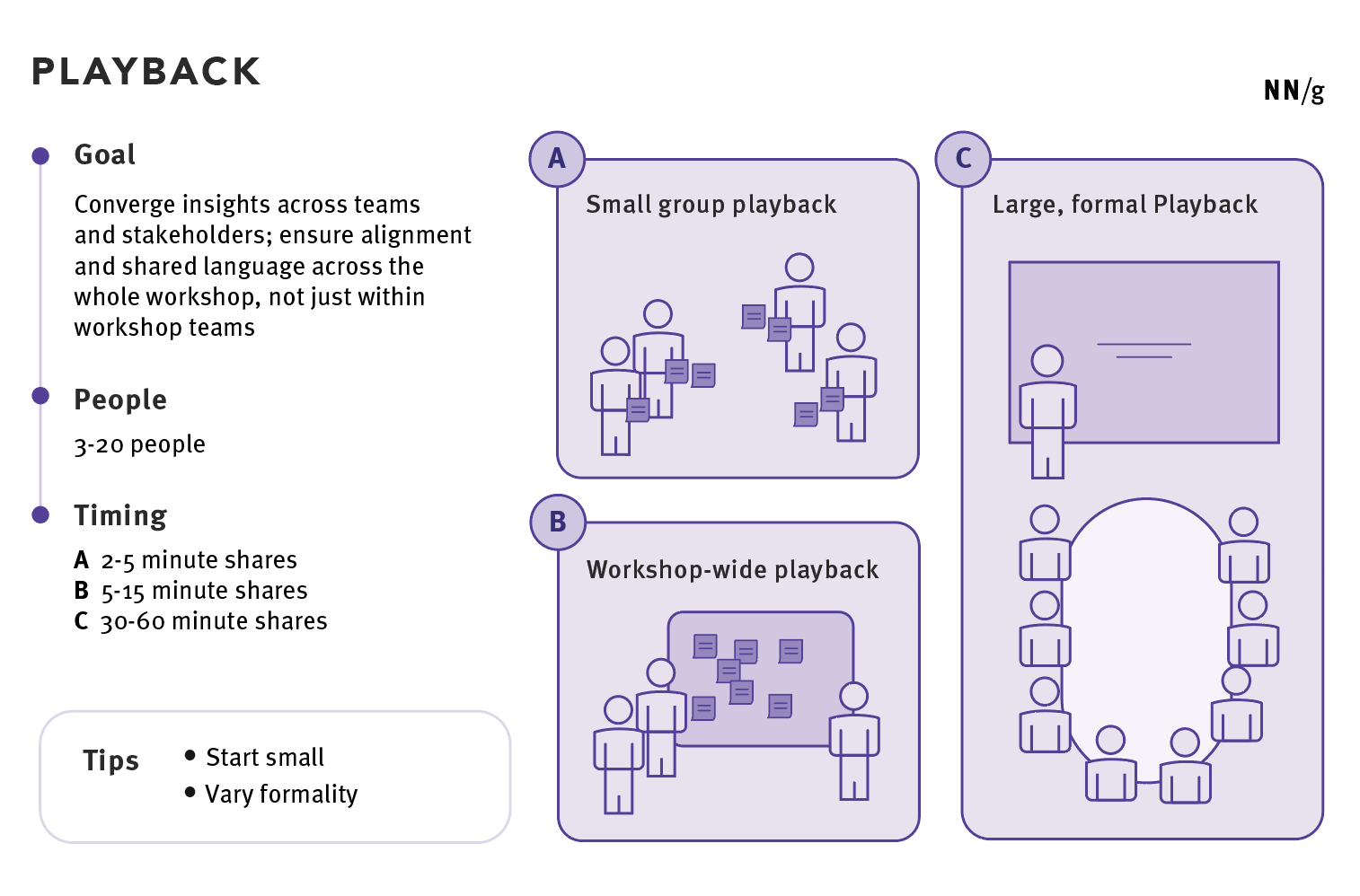- 在長時間的工作坊中交替使用正式和非正式分享形式。