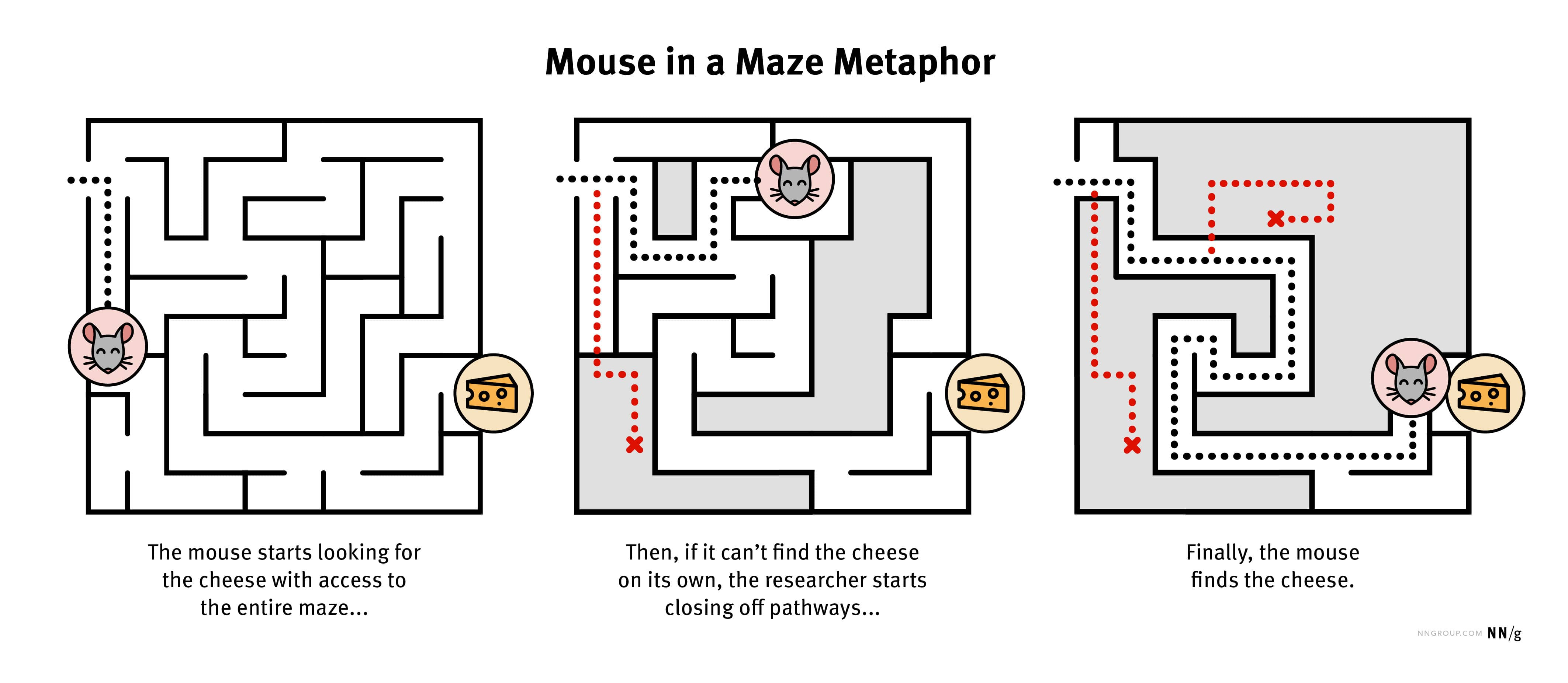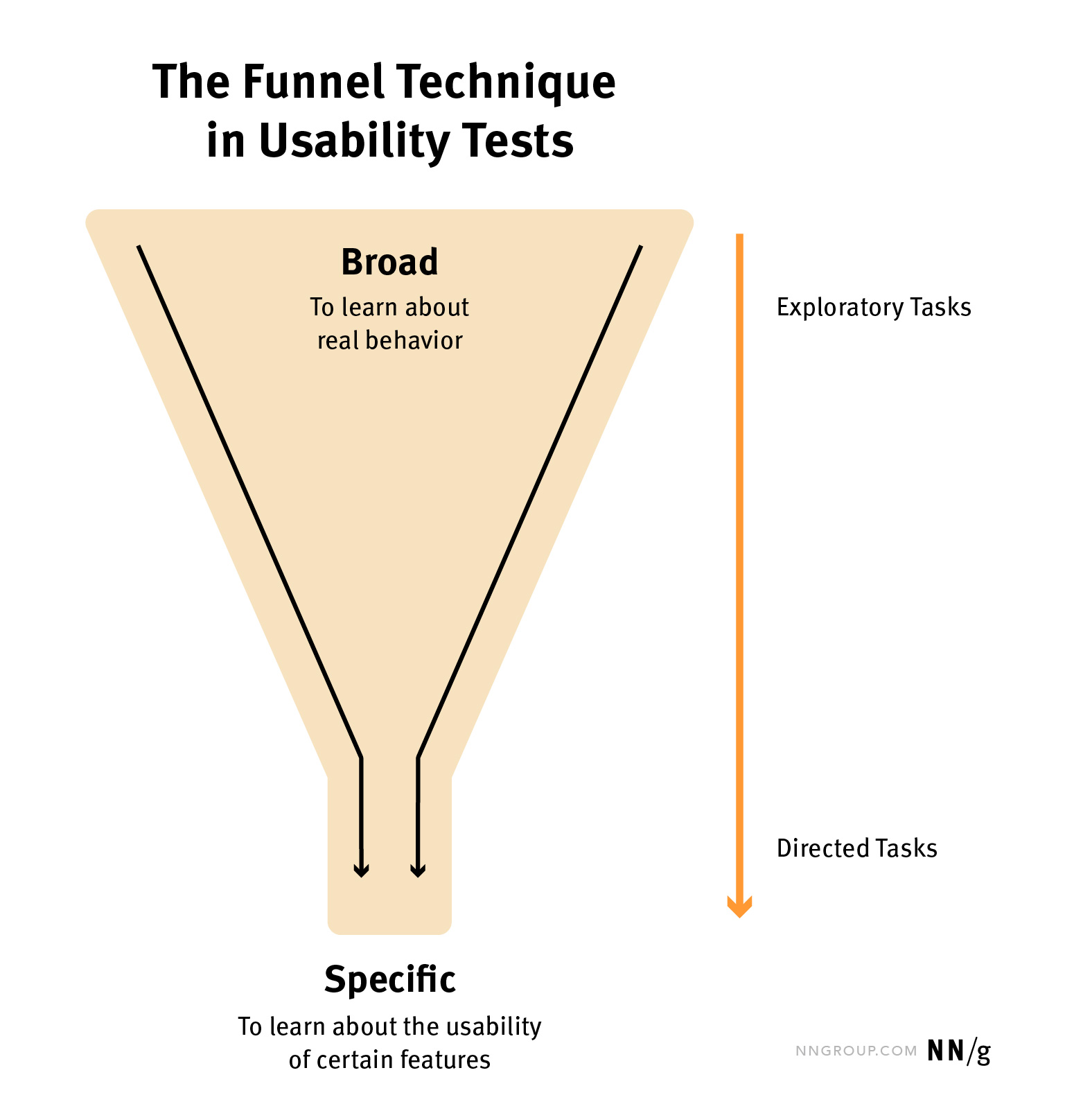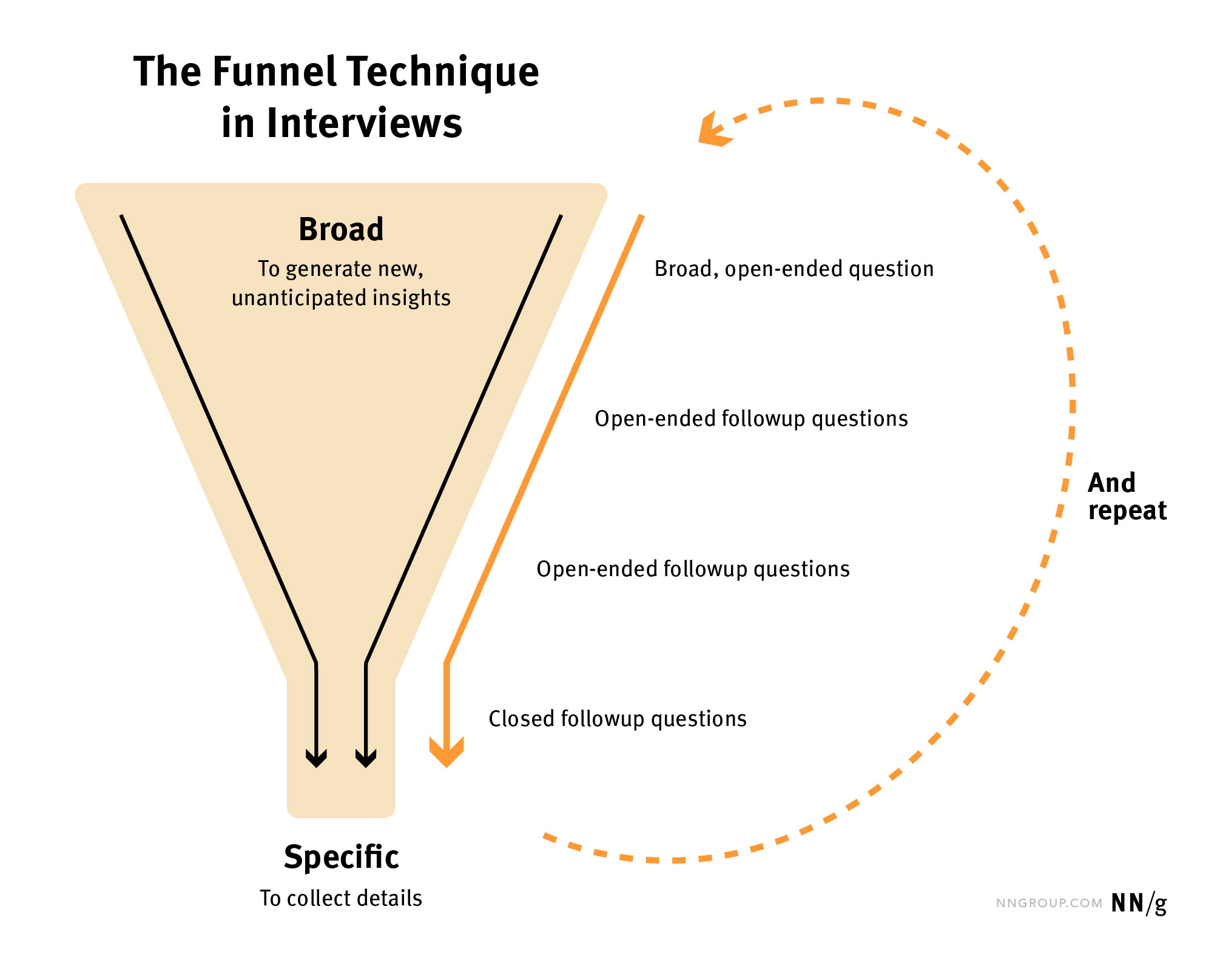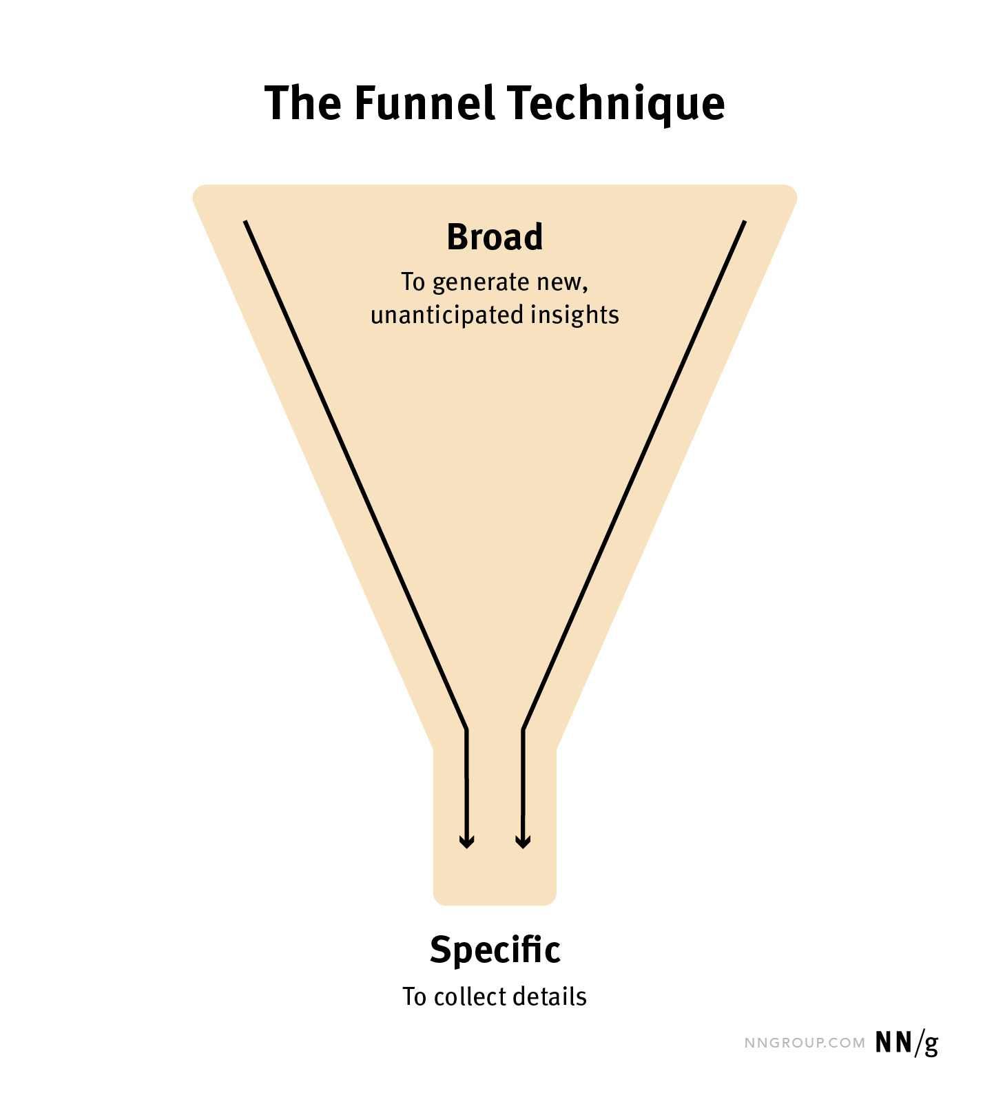 漏斗的頂部寬而底部窄,可以引導物質從寬入口流向狹窄出口。同樣,在使用者研究中,漏斗技術透過從一般到具體的逐步縮小問題範圍,以避免過早引導參與者行為或感知,確保資料的自然性。