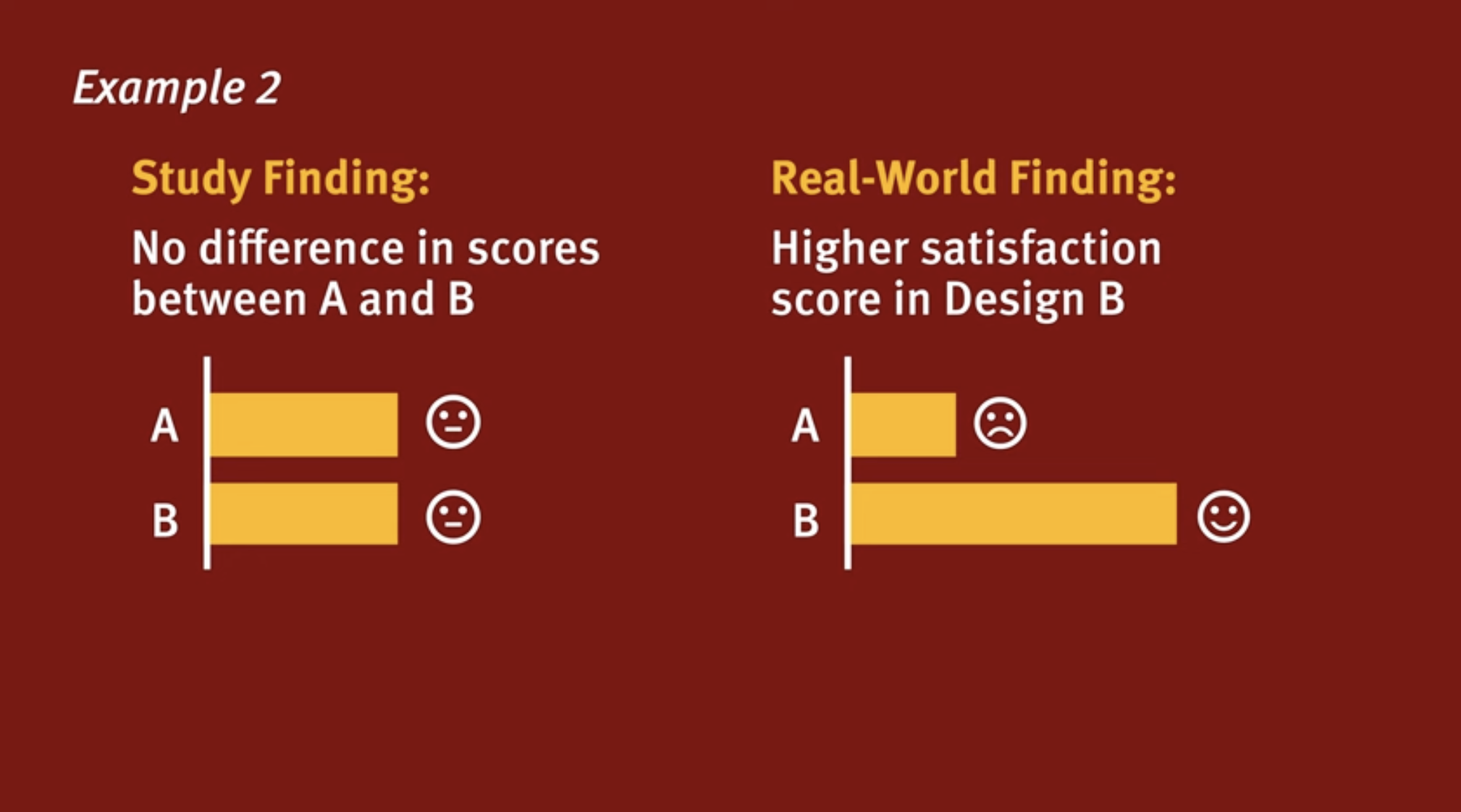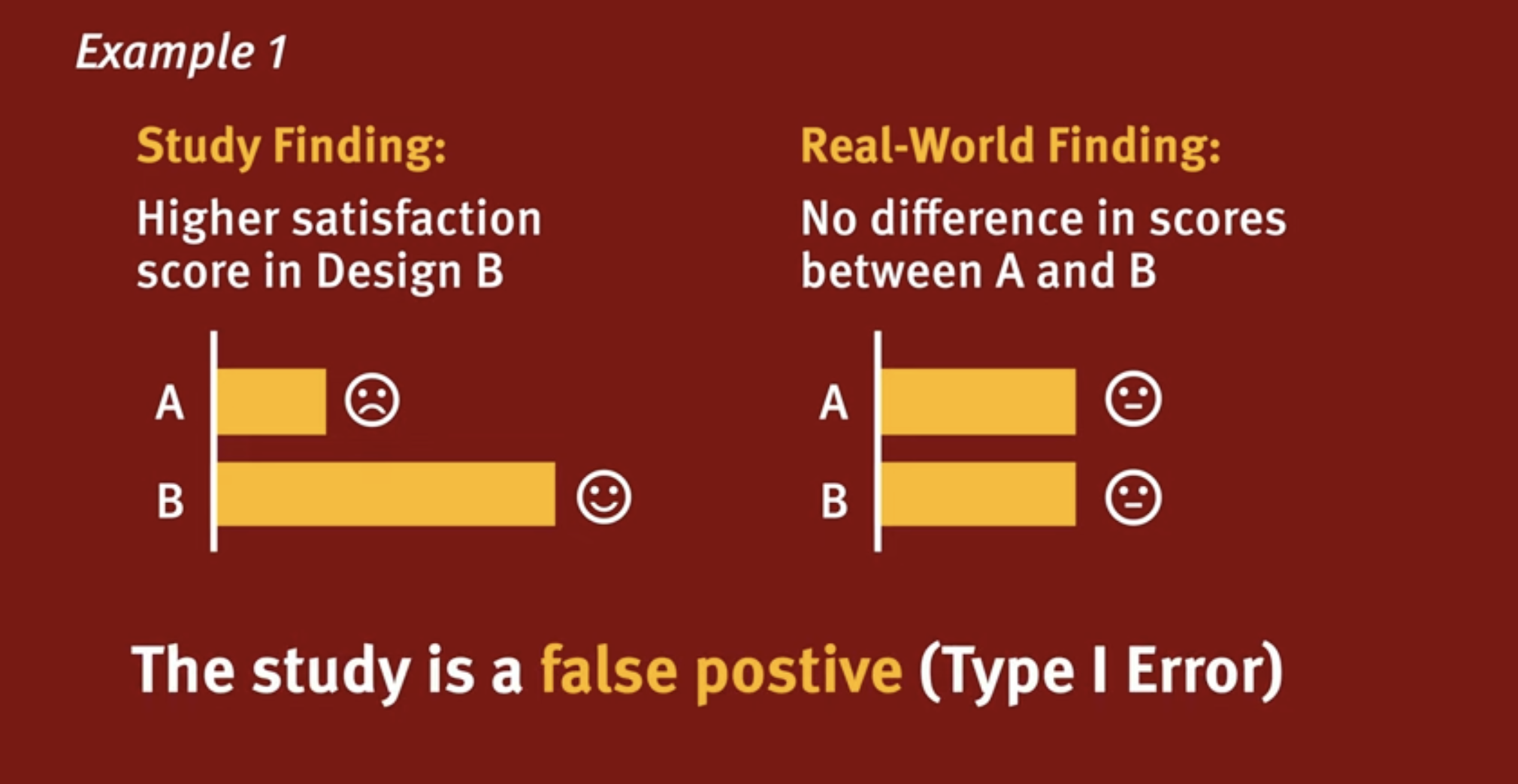 例子:假設我進行了一項定量可用性測試,比較了兩種設計的使用者滿意度。在測試中,30名參與者顯示出其中一個設計的滿意度更高,這似乎是個好訊息。但當這個設計正式向所有使用者推出後,滿意度並沒有任何提高。我會得出結論,這項研究可能遭遇了假陽性錯誤。