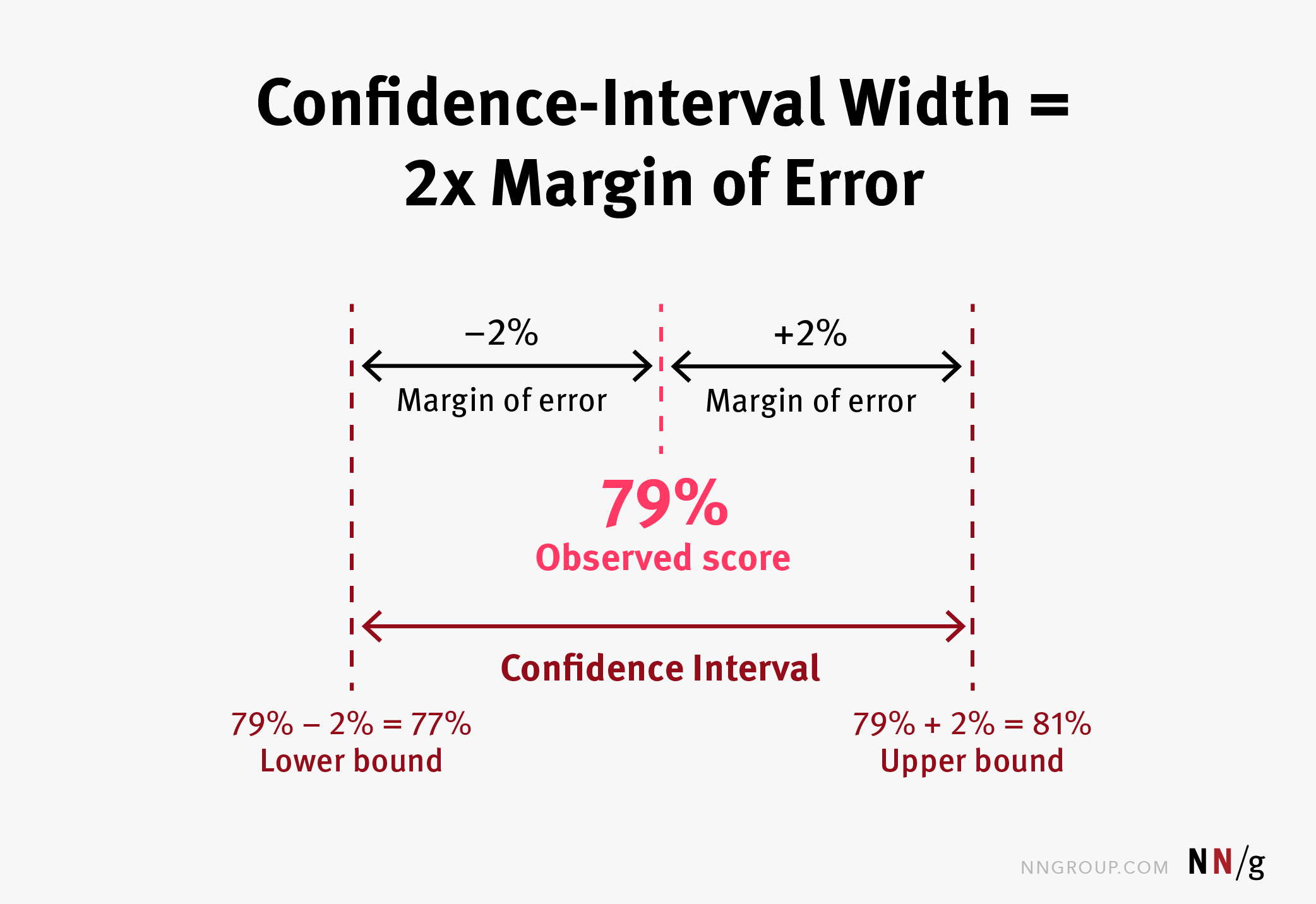 在量化使用者體驗研究中,較窄的信心區間提供了更多資訊。例如,如果任務的成功率為 40%,而信心區間在 0%-80% 之間,則難以解讀資料。而若信心區間縮小到 35%-45%,則可為介面可用性提供更明確的資訊。