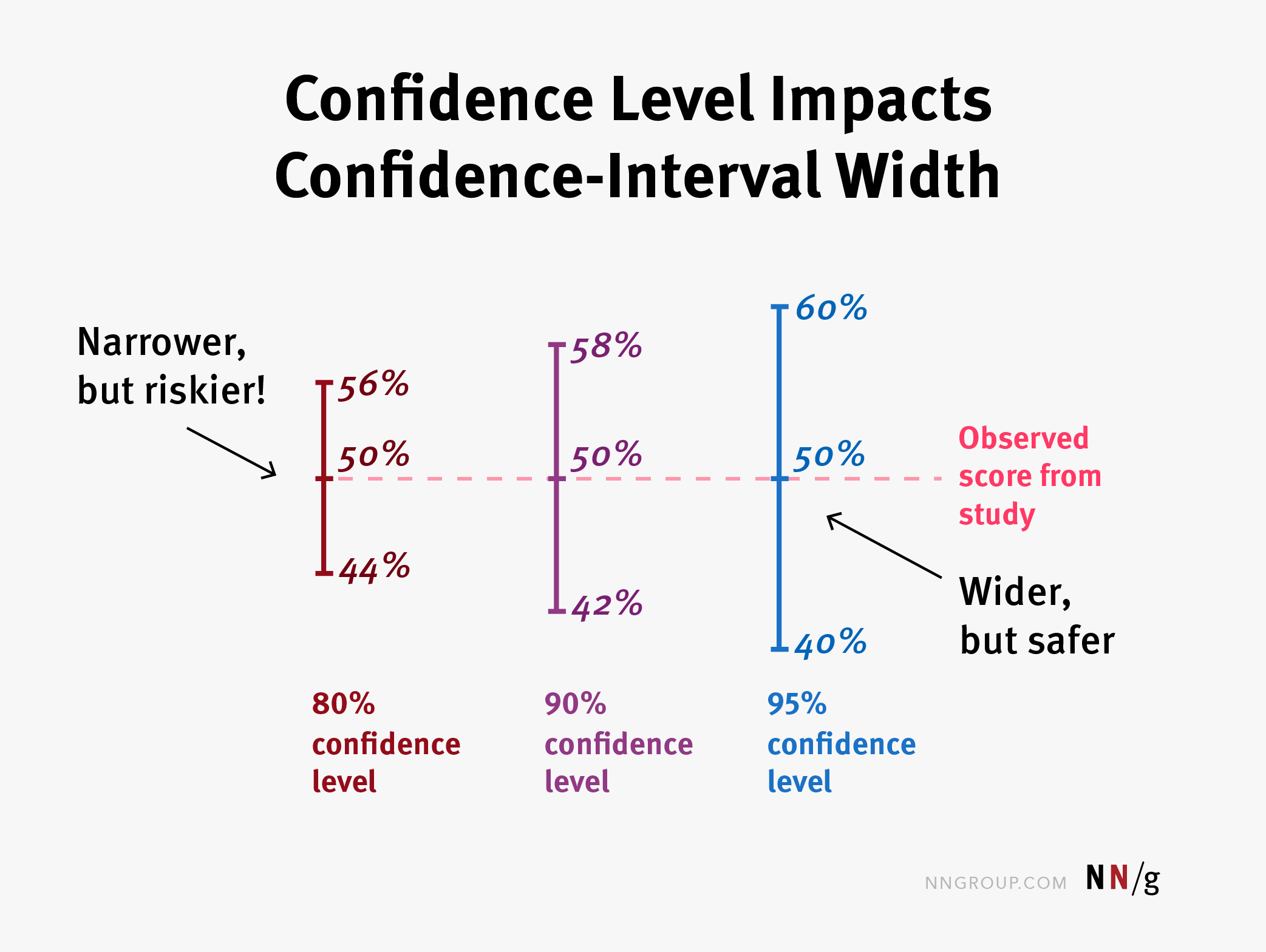 儘管科學出版物通常使用 95% 的信心水平,但在使用者體驗研究中,信心水平可以根據實際情況進行調整。例如: