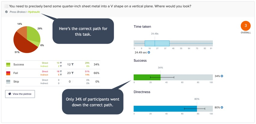 研究團隊隨後使用Treejack工具進行了樹狀測試,測試了64名參與者,任務涵蓋八個頂級產品類別的查詢任務。初始導航的平均得分僅為4/10,表明導航需要顯著改進。