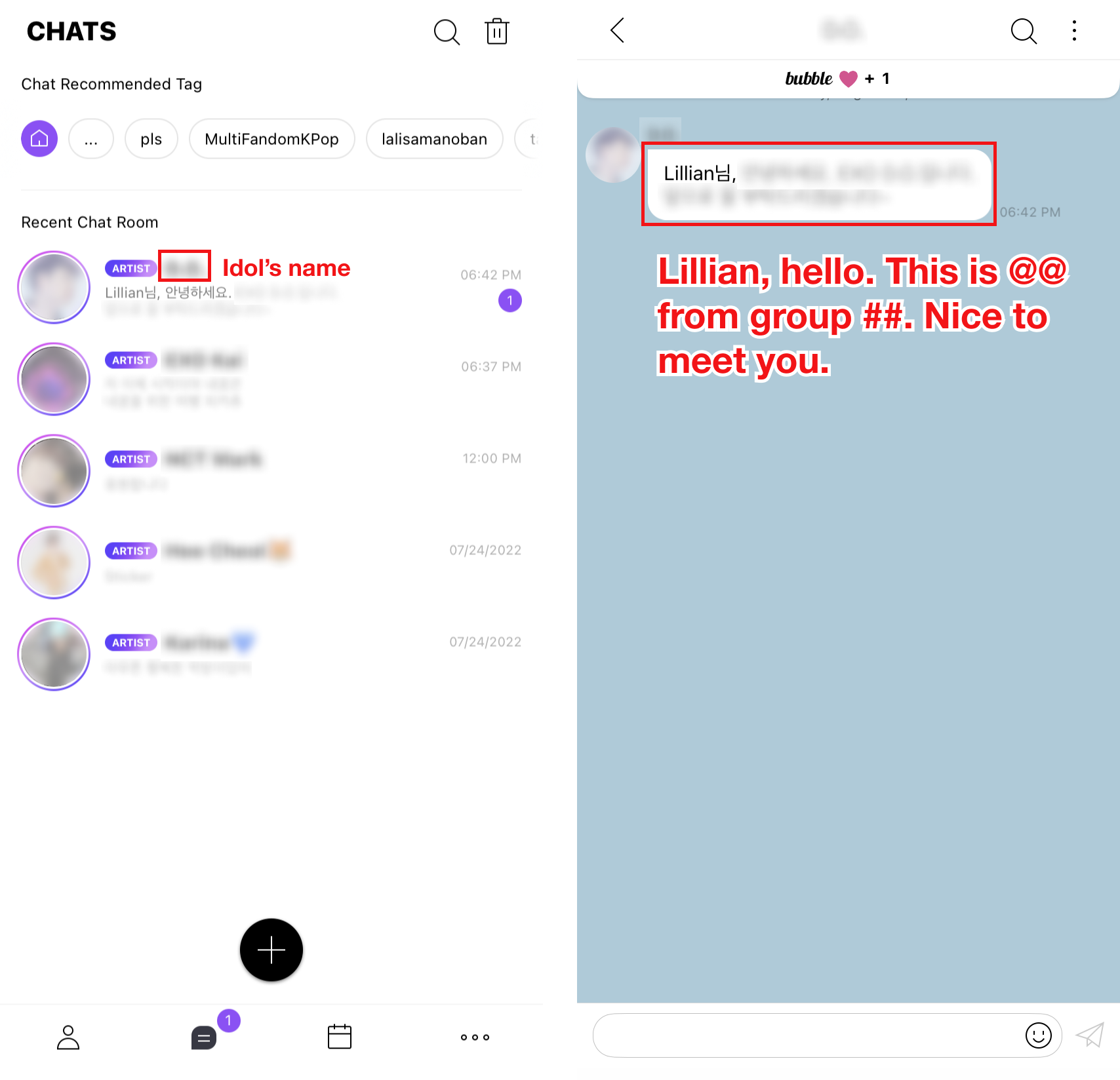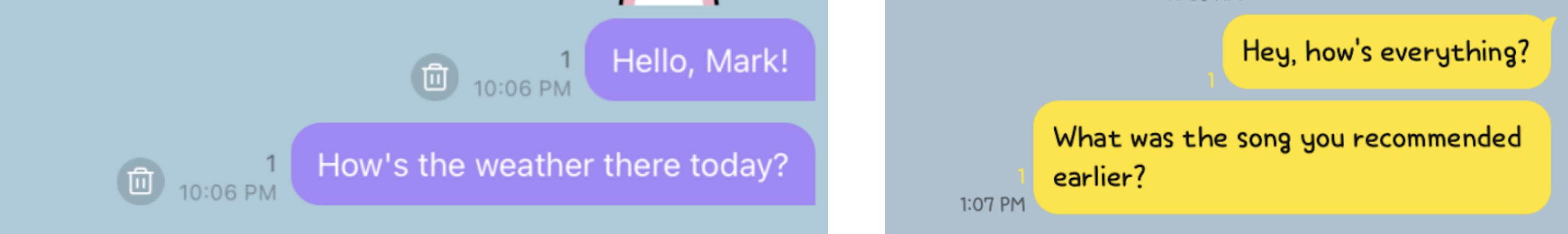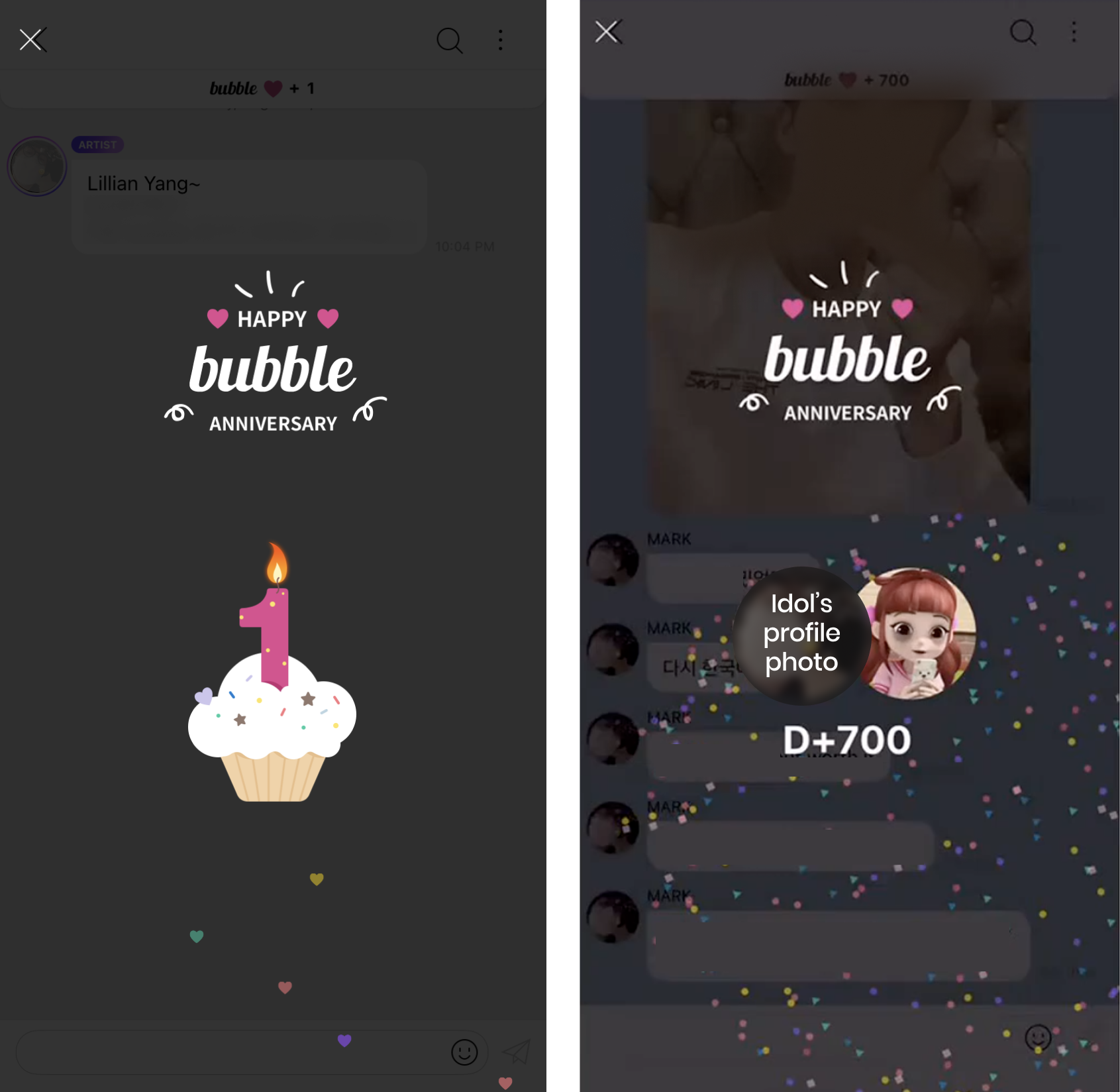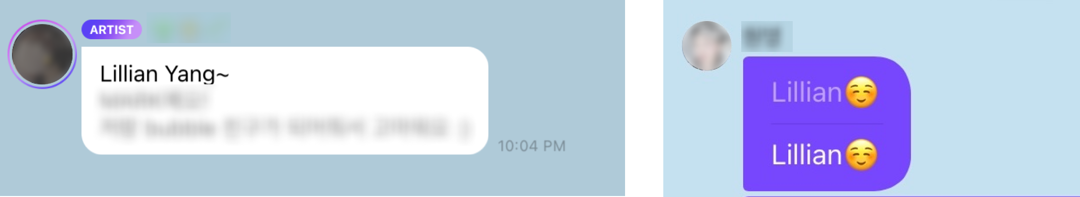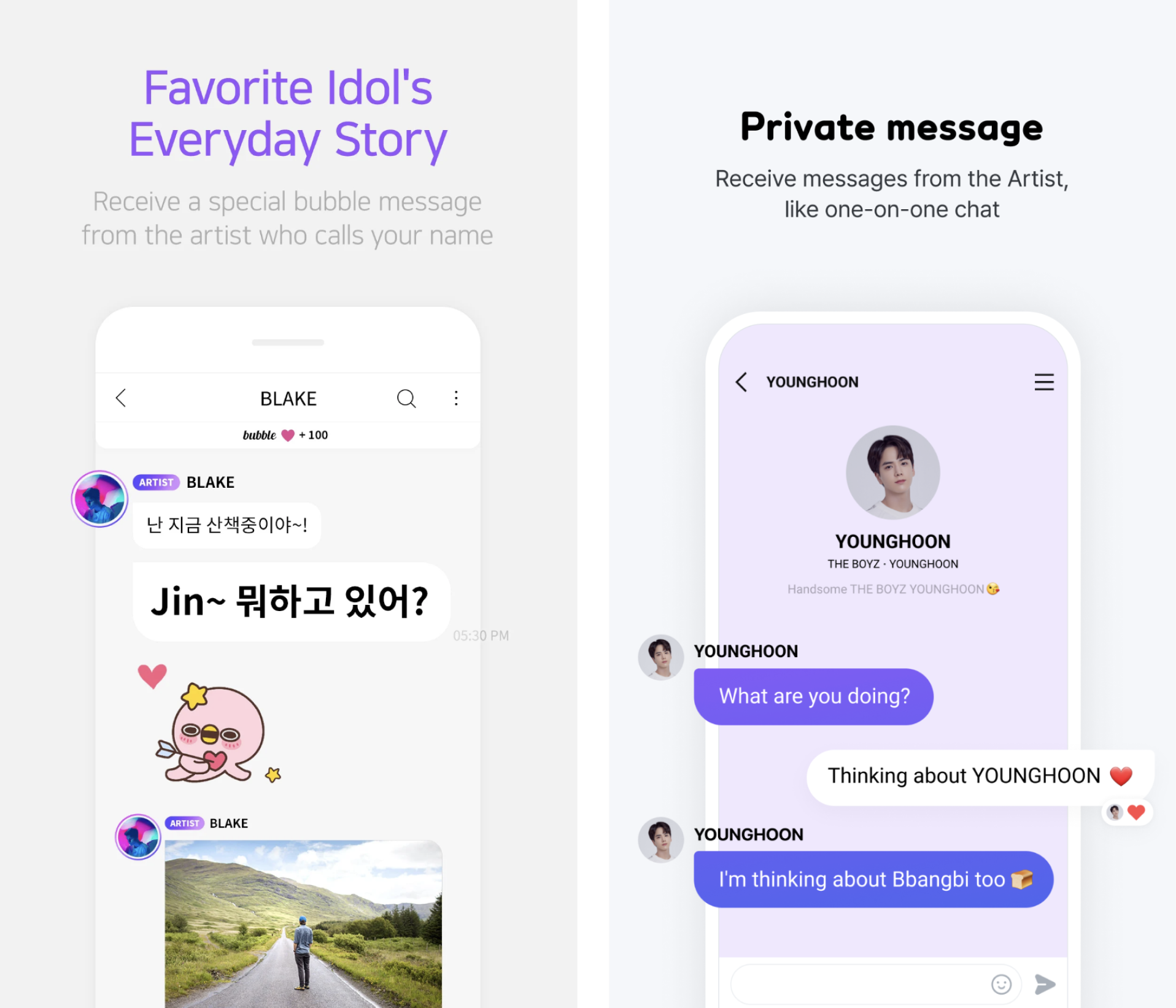 類似日常聊天工具的介面:應用介面與韓國主流聊天工具(如Kakao Talk)極為相似,例如聊天氣泡樣式、已讀未讀的“1”標記等。這種設計讓粉絲覺得自己正在與偶像真實對話。