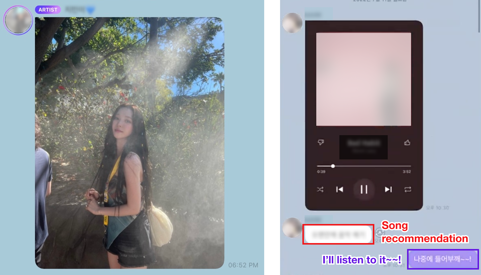 案例:一位偶像向粉絲髮送了他推薦的歌曲連結,這種分享讓粉絲覺得自己是被“特別關注”的。有時,偶像分享的內容看似特別私人,例如未釋出的音訊片段或深夜心情記錄,這種接觸讓粉絲感到偶像是“真實的人”,而非單純的明星。