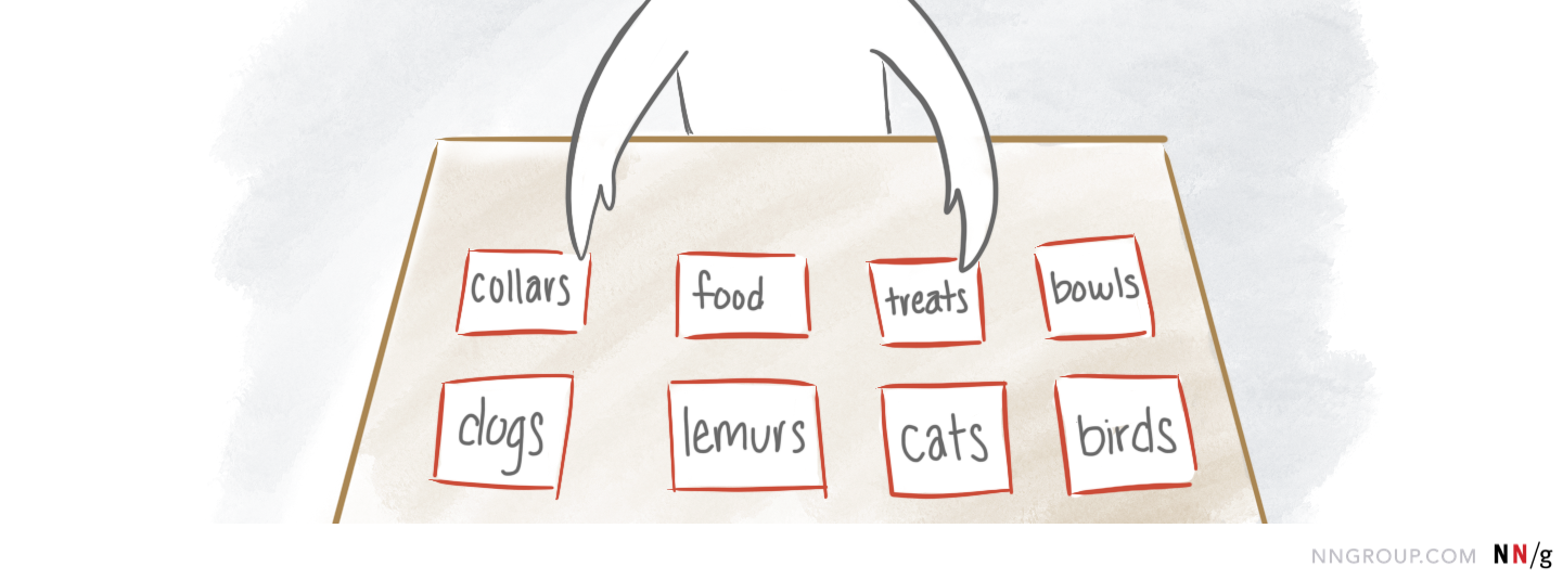 - 描述:讓參與者將內容分組並命名,幫助理解使用者對資訊空間的邏輯分類。
