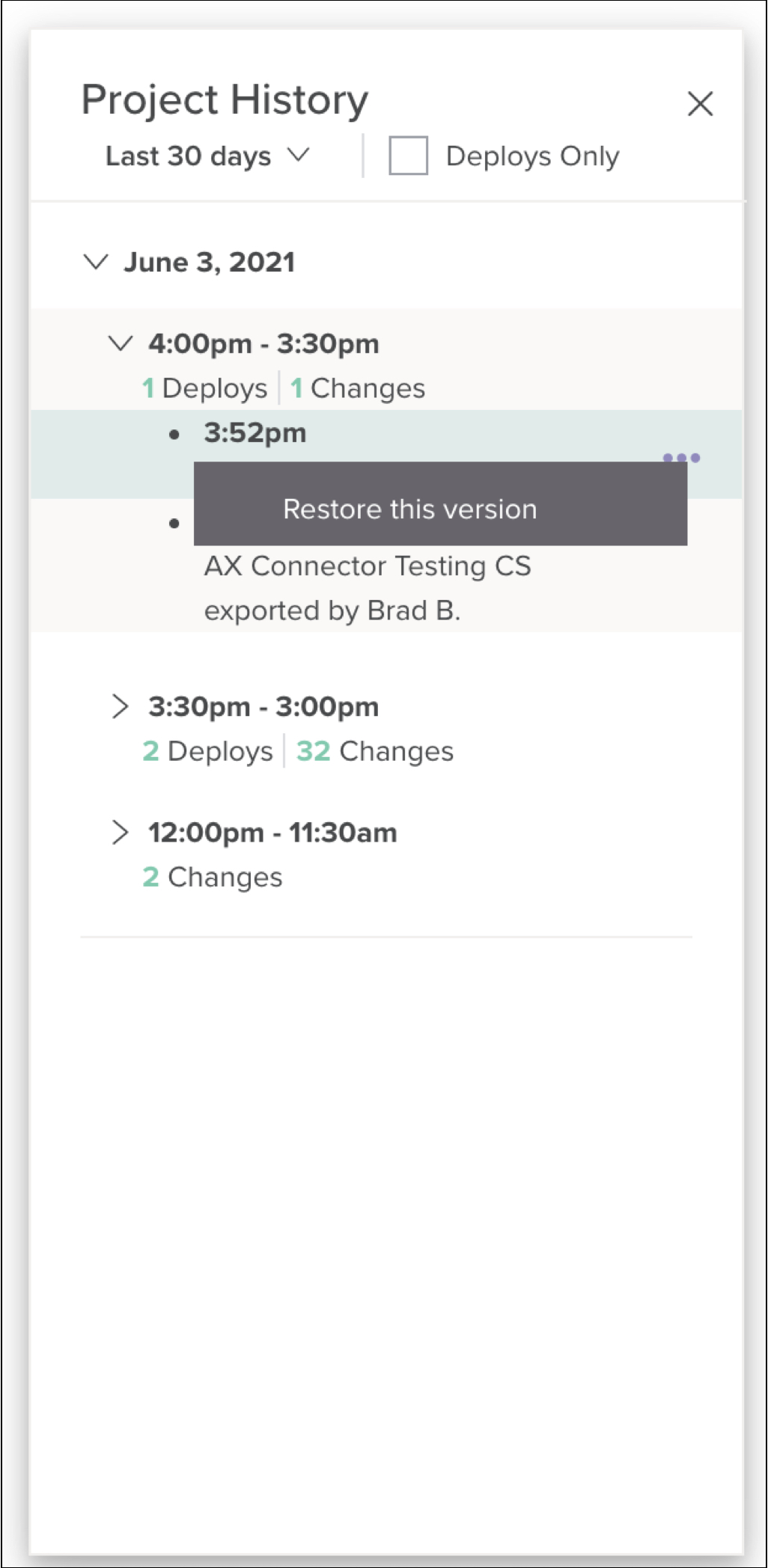 優秀示例:Jitterbit Cloud Studio 提供專案歷史時間線,使用者可檢視更改記錄並恢復早期版本。