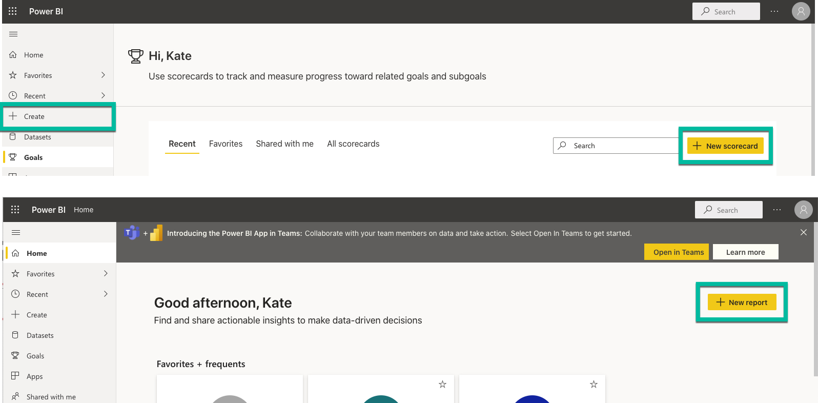 優秀示例:Microsoft Power BI 在所有工作區使用統一的“+”號表示新增新元素。