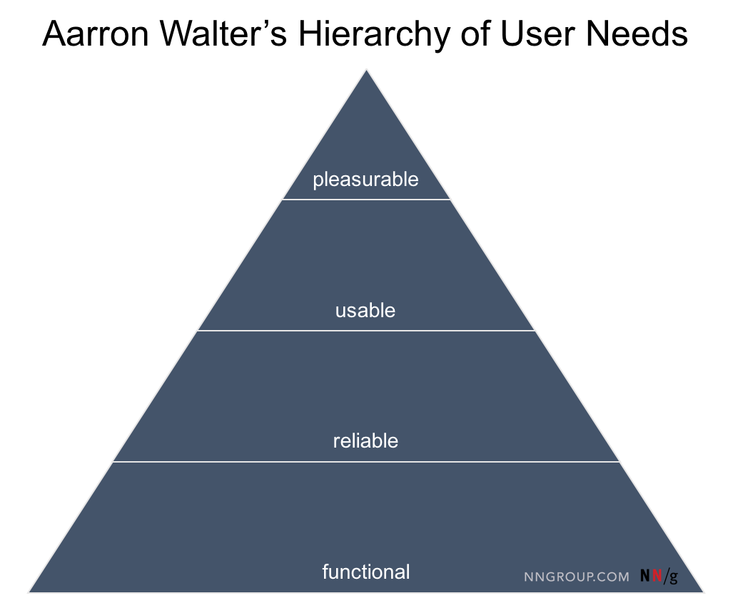 Aarron Walter 在其著作 《情感化設計》(Designing for Emotion) 中提出了與 Maslow 人類需求層次類似的使用者需求層次理論: