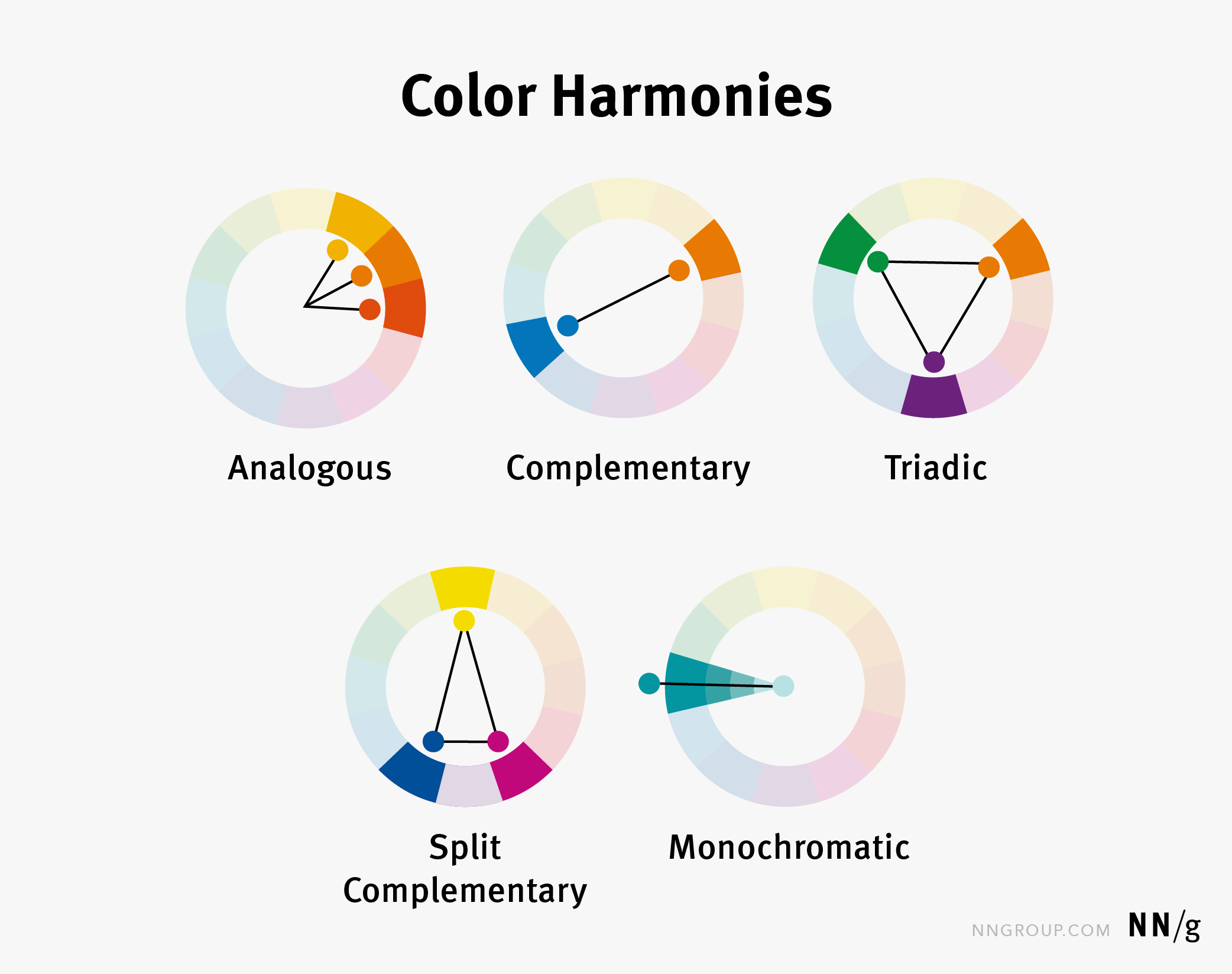 顏色理論是關於顏色搭配的各種規則或原則,其中一個核心概念是顏色和諧,即一組顏色能良好地搭配在一起。常見的顏色和諧方式包括: