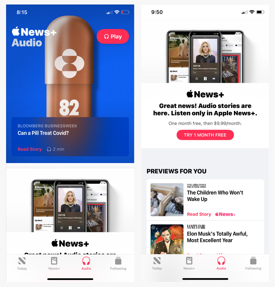 案例:Apple News 應用利用白色和淺灰作為主色和次色,粉色作為強調色,並遵循 60-30-10 比例。