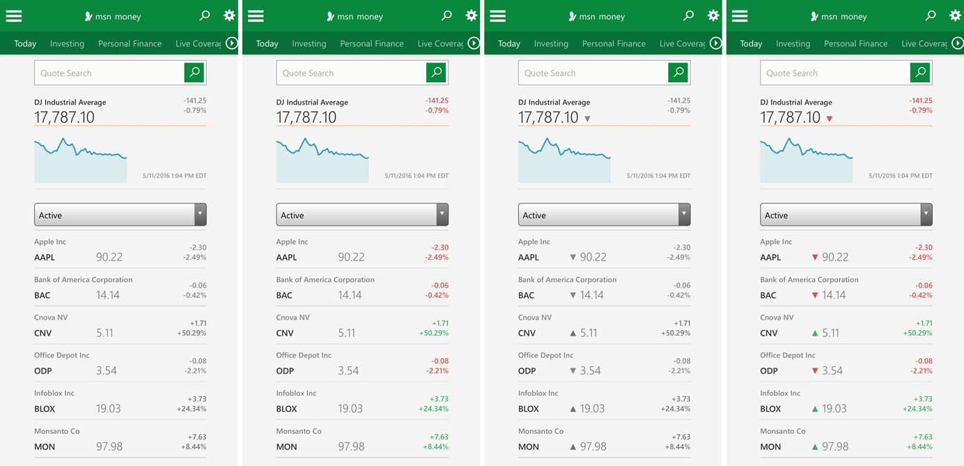 選擇了4個移動頁面(包括電商列表和股票資料表)進行測試。每種頁面中有兩類需要標識的專案(如股票資料表中標記“上漲”和“下跌”的股票)。設計了以下4種視覺標識: