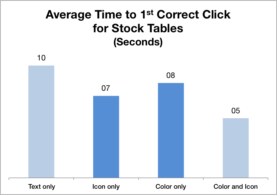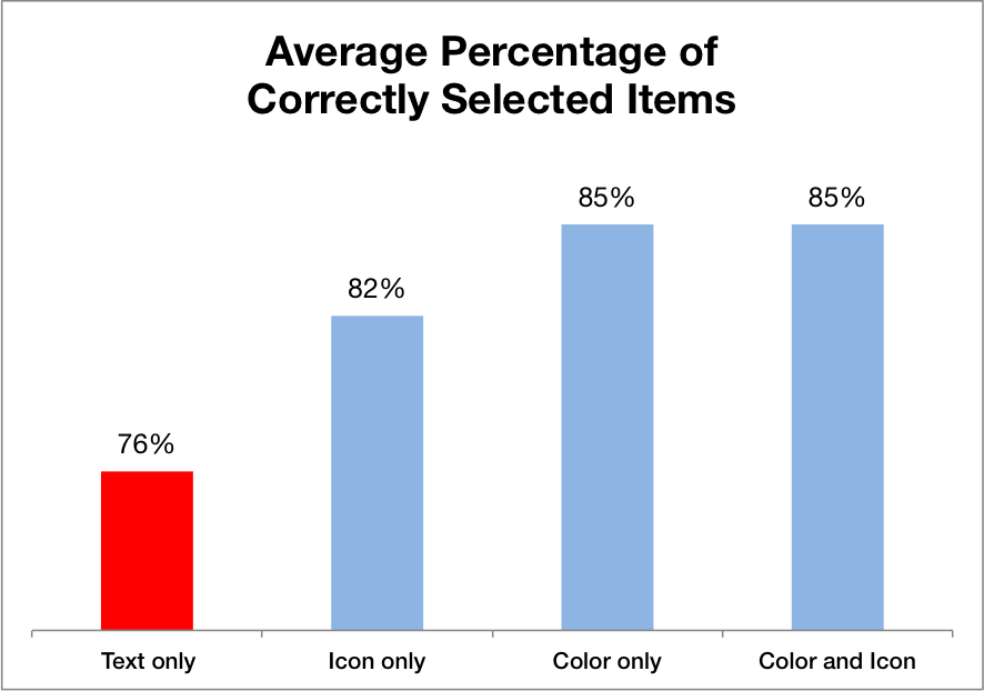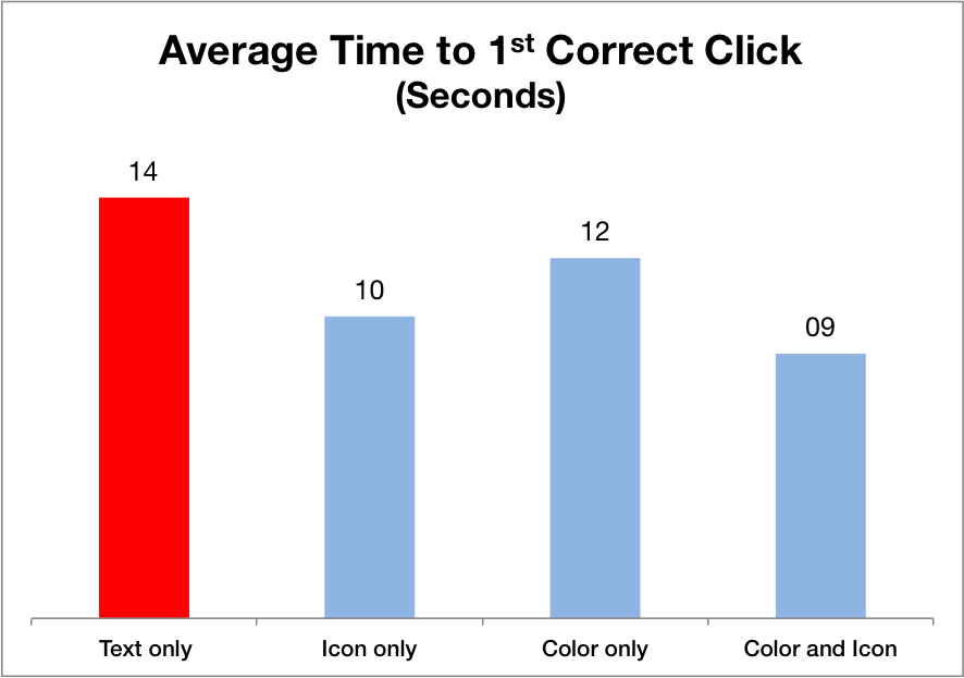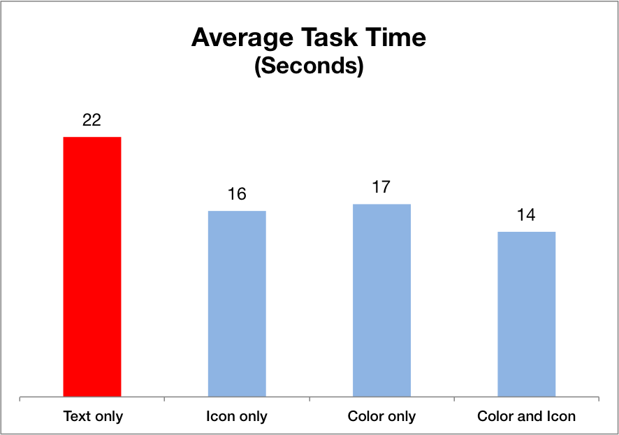 在移動裝置測試中,同時使用顏色和圖示的標識比僅使用文字快37%。儘管未在更大的桌面螢幕上測試,但可以推測類似的結果也會出現,甚至速度提升的效果可能更明顯。