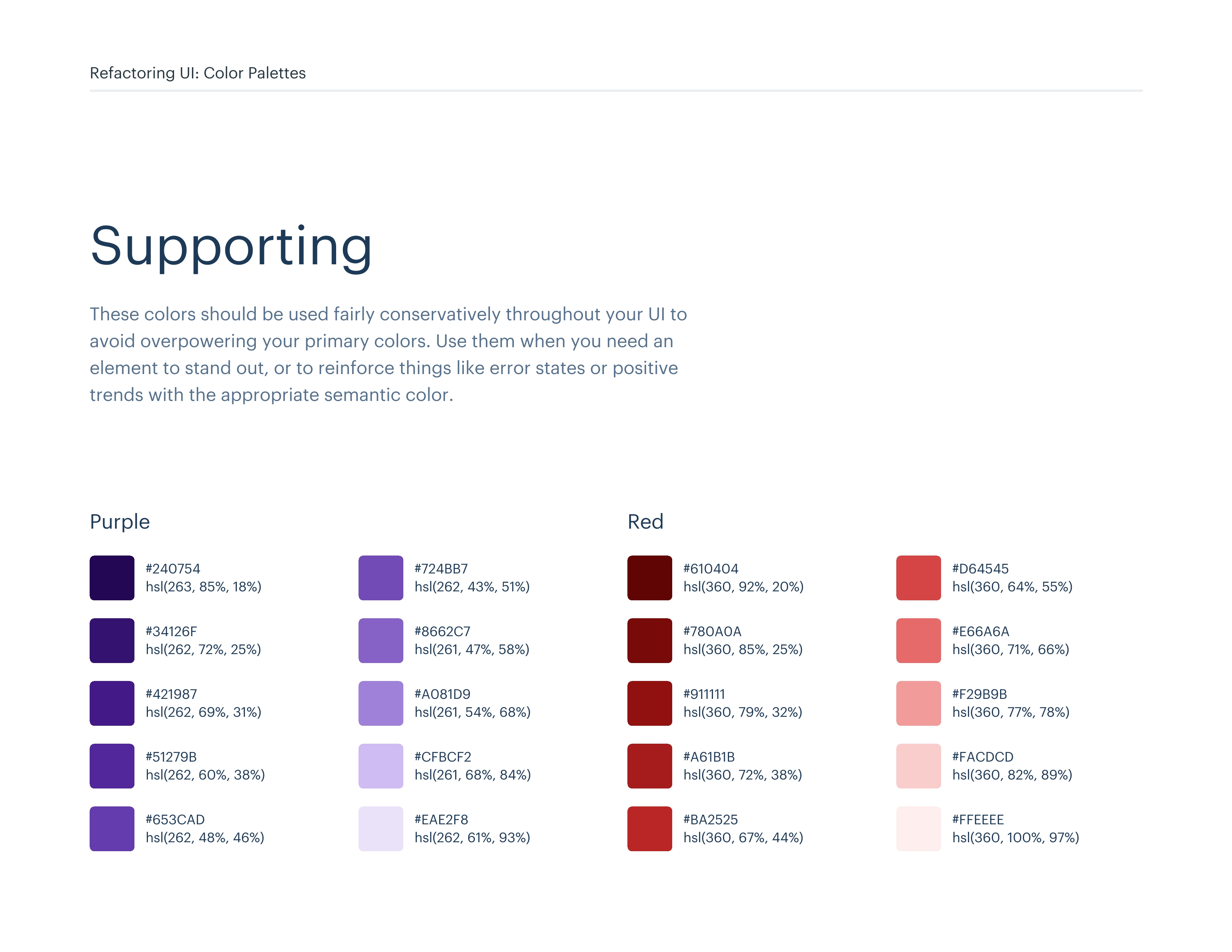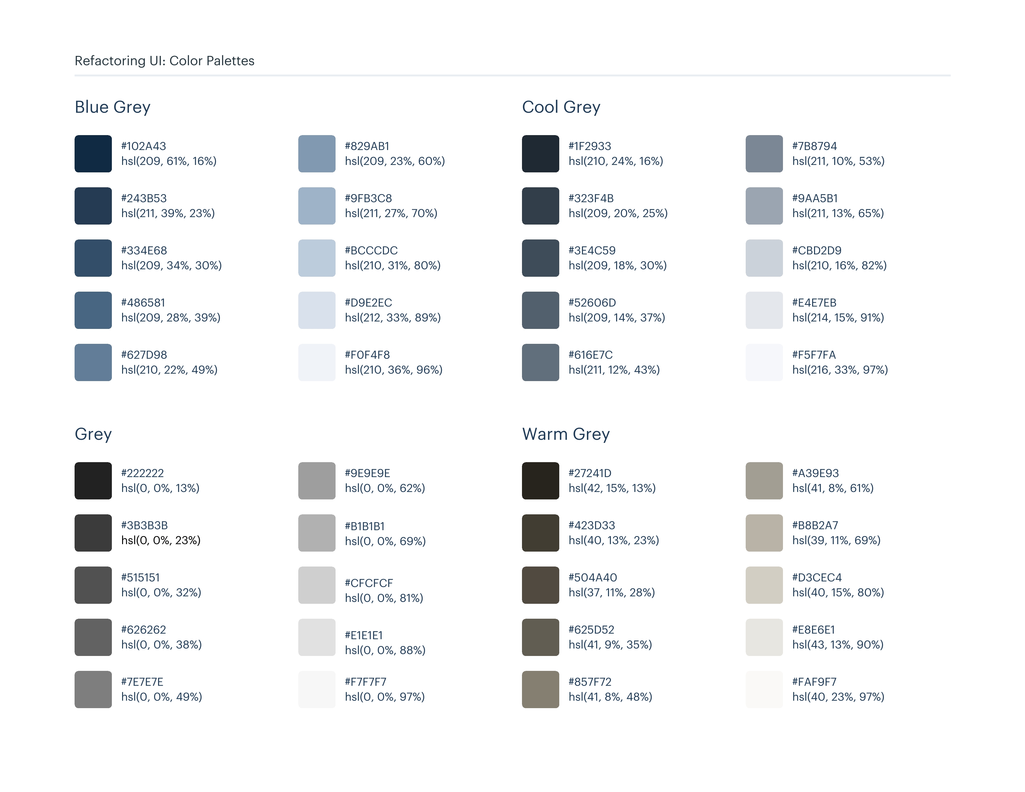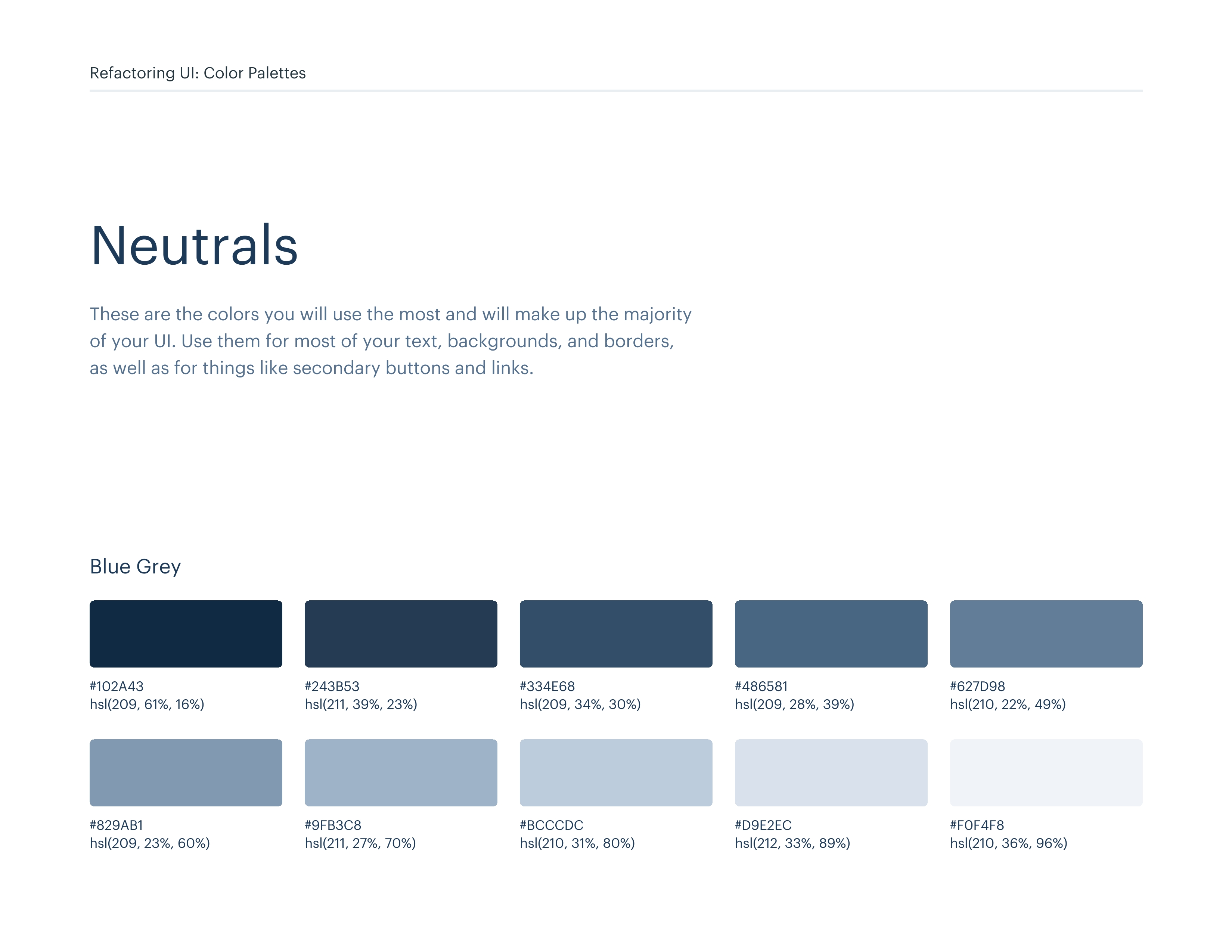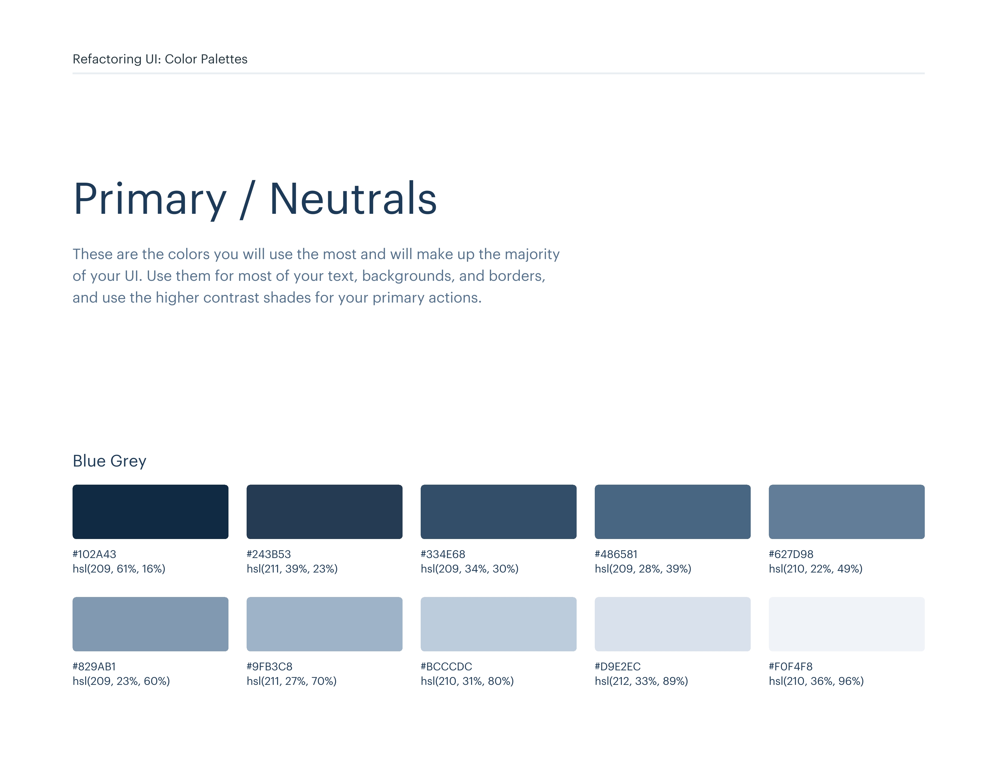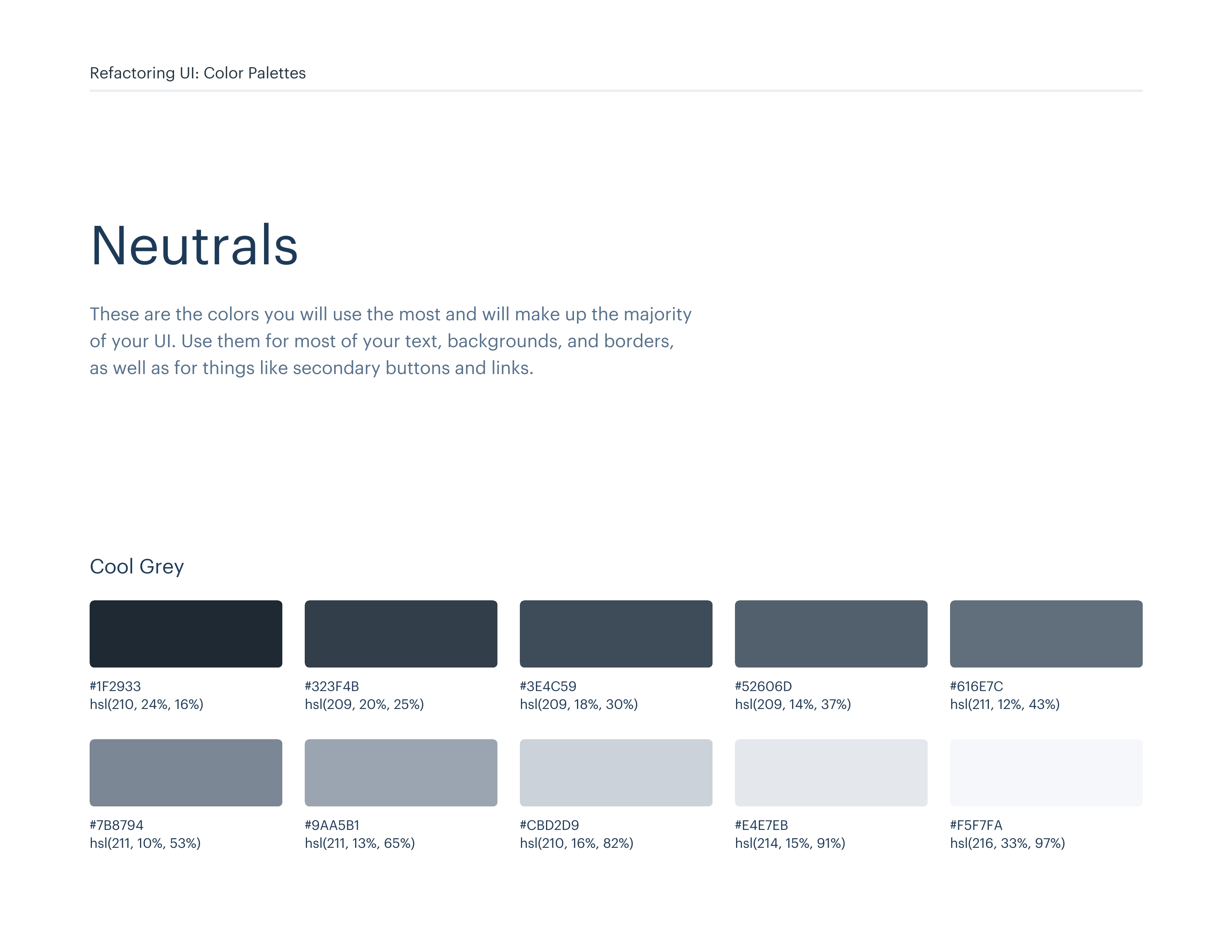 These are the colors you will use the most and will make up the majority of your UI. Use them for most of your text, backgrounds, and borders, as well as for things like secondary buttons and links.