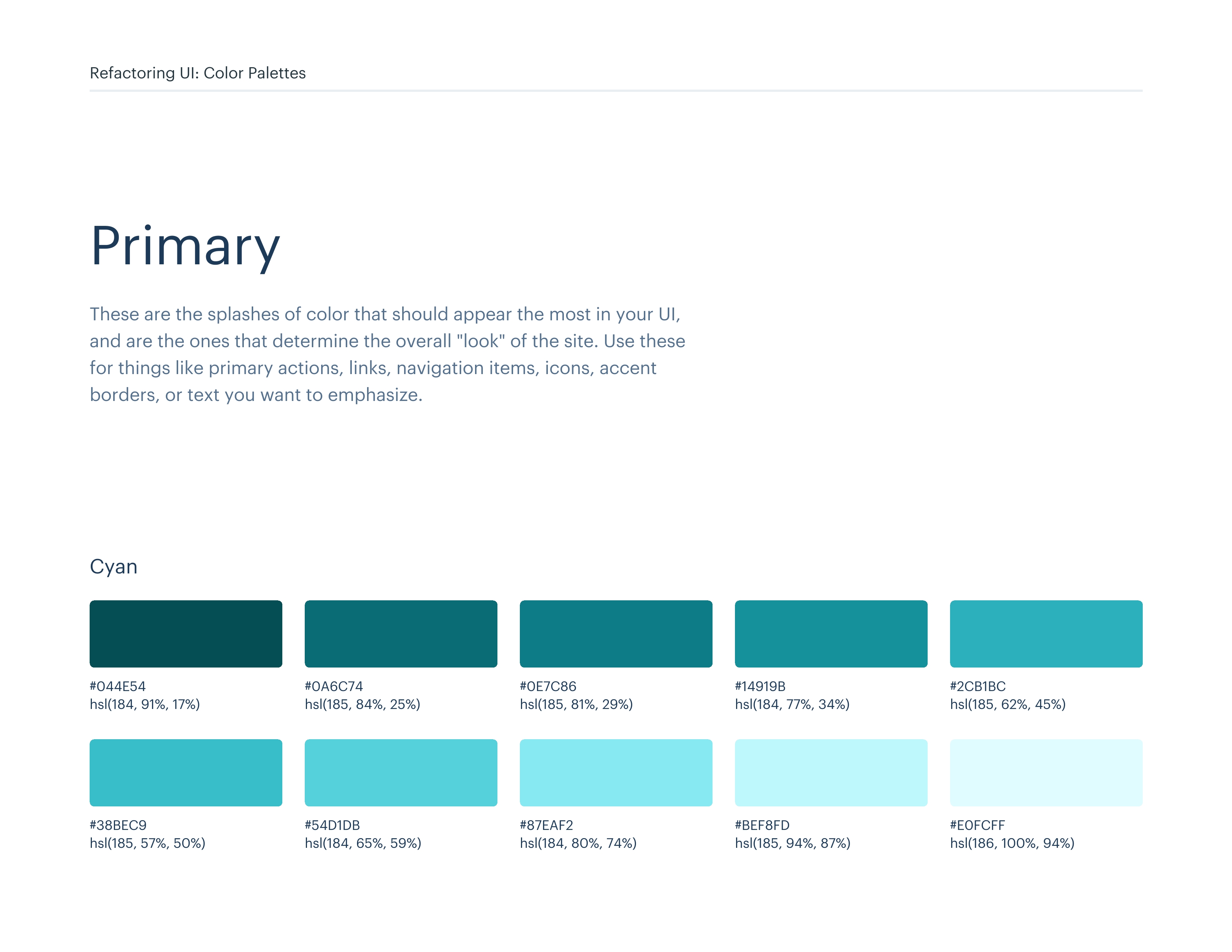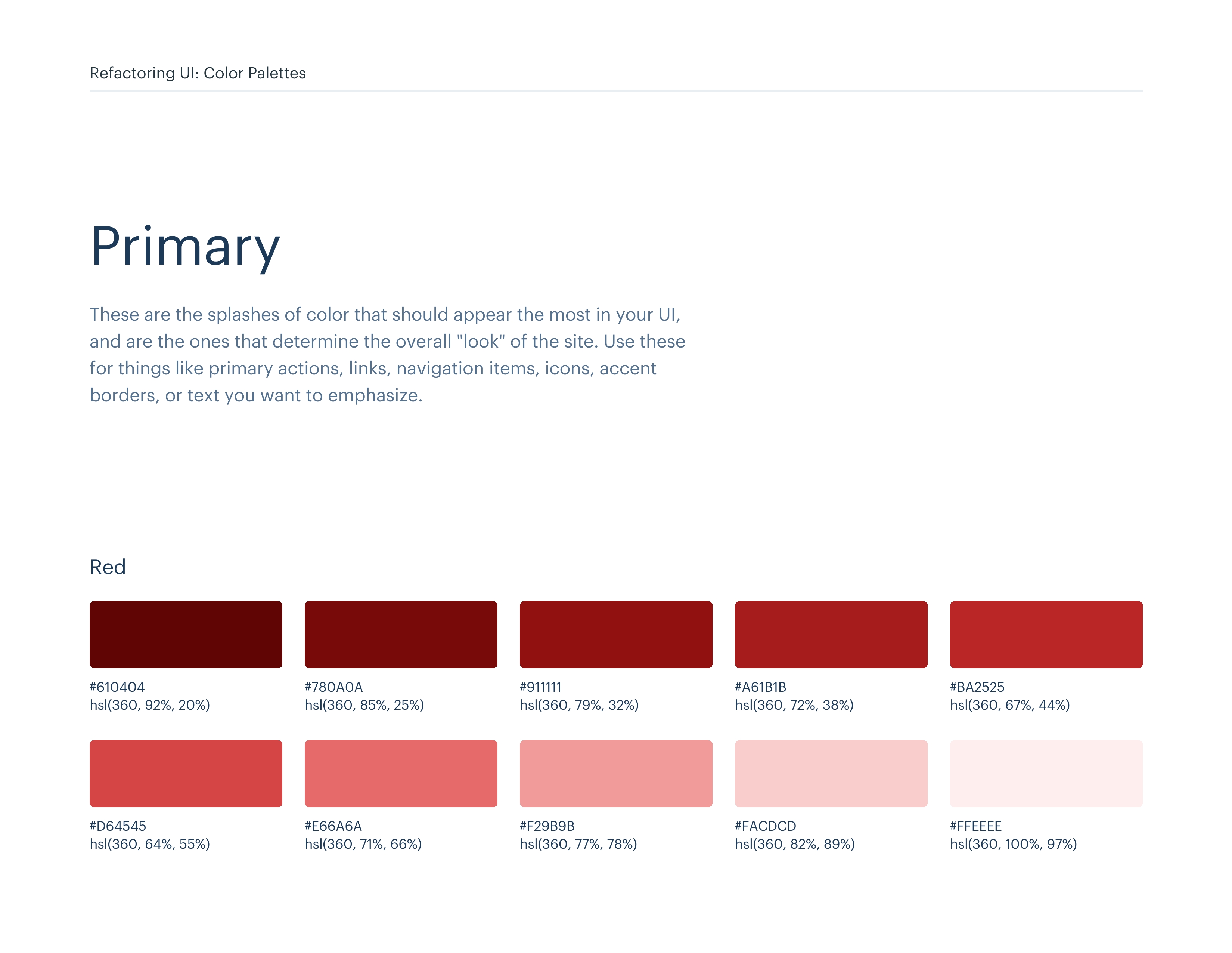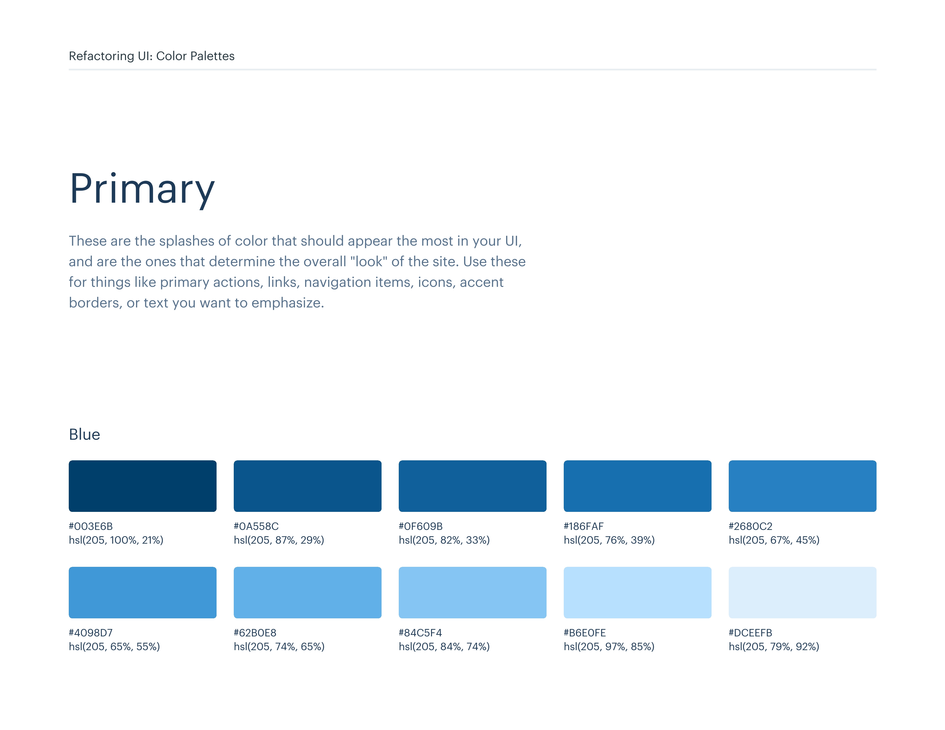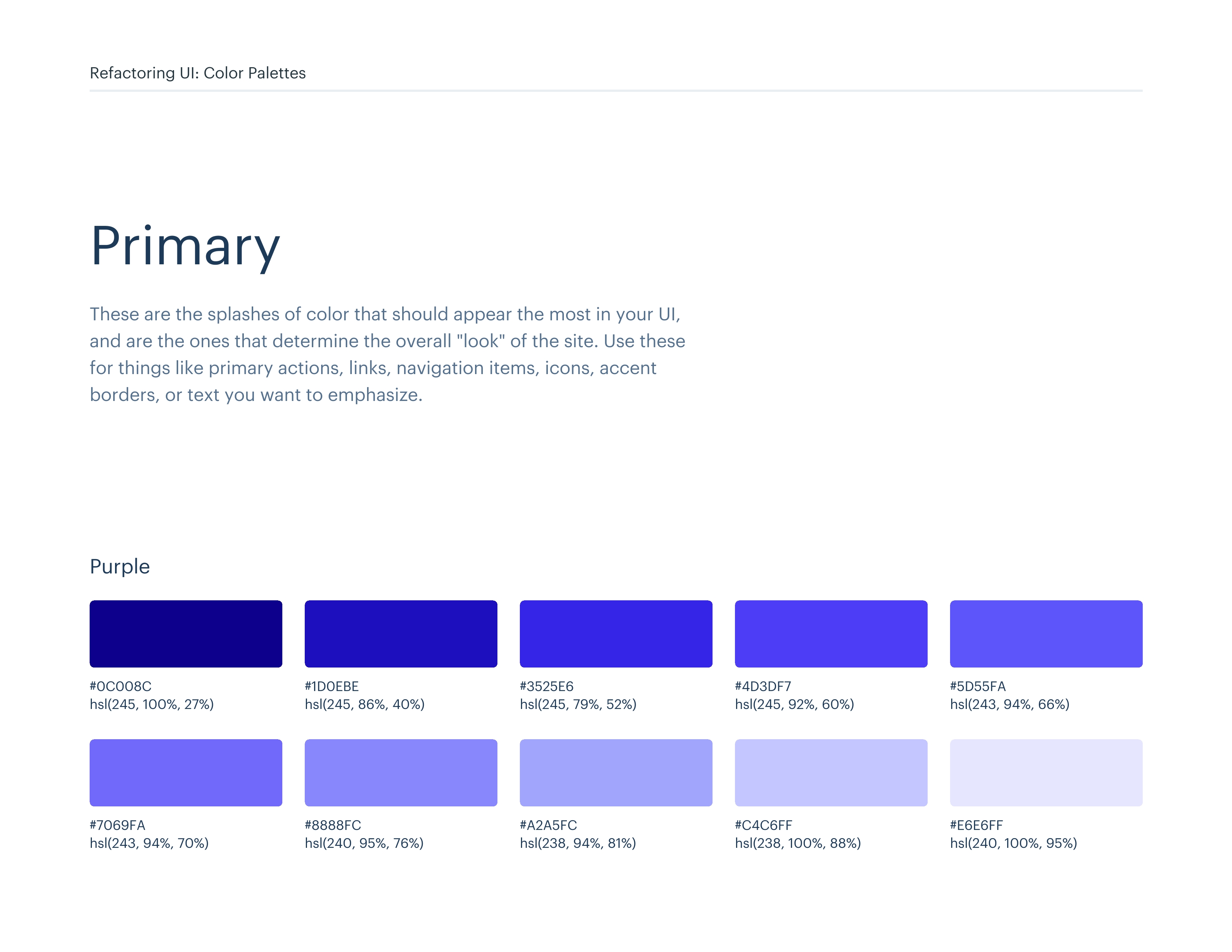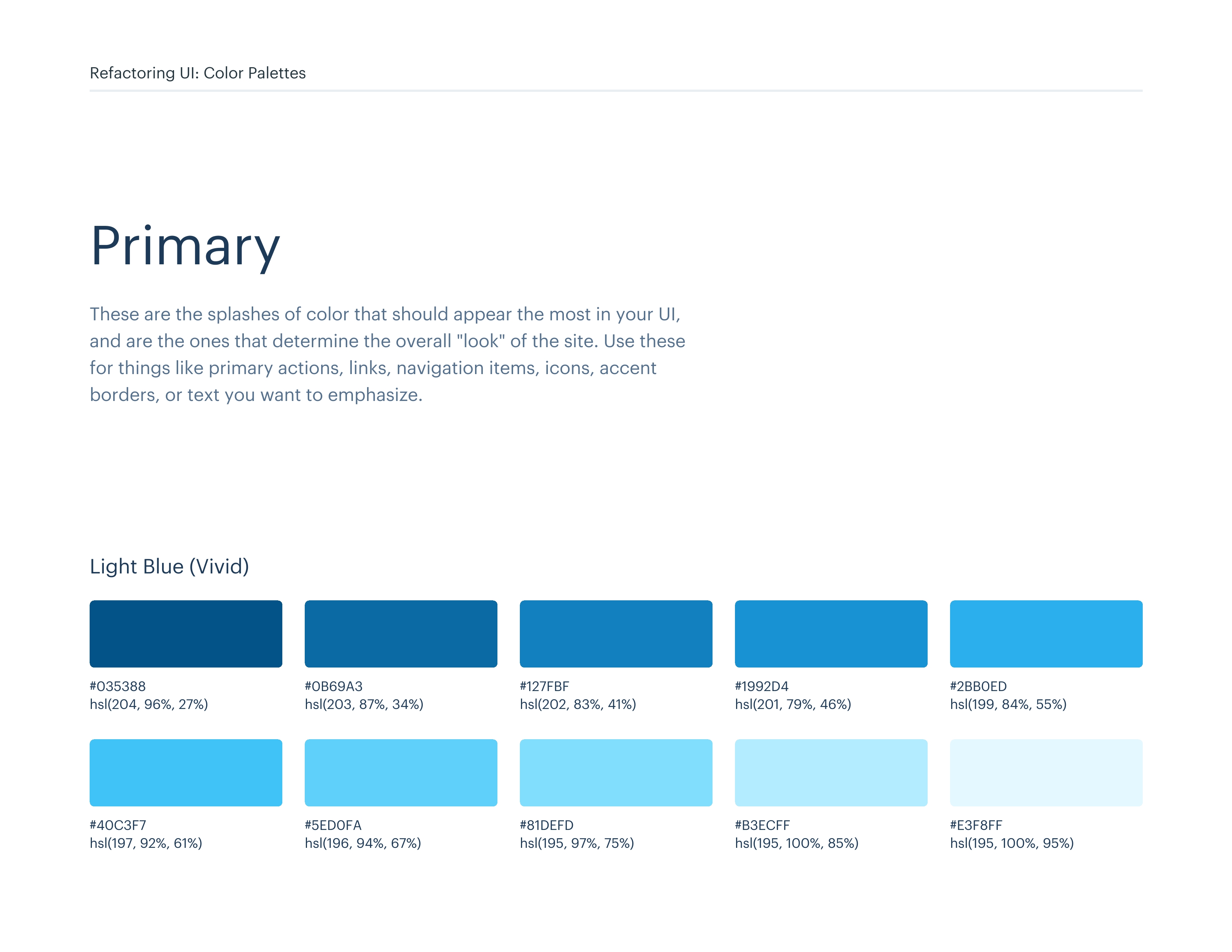 These are the splashes of color that should appear the most in your UI, and are the ones that determine the overall "look" of the site. Use these for things like primary actions, links, navigation items, icons, accent borders, or text you want to emphasize.