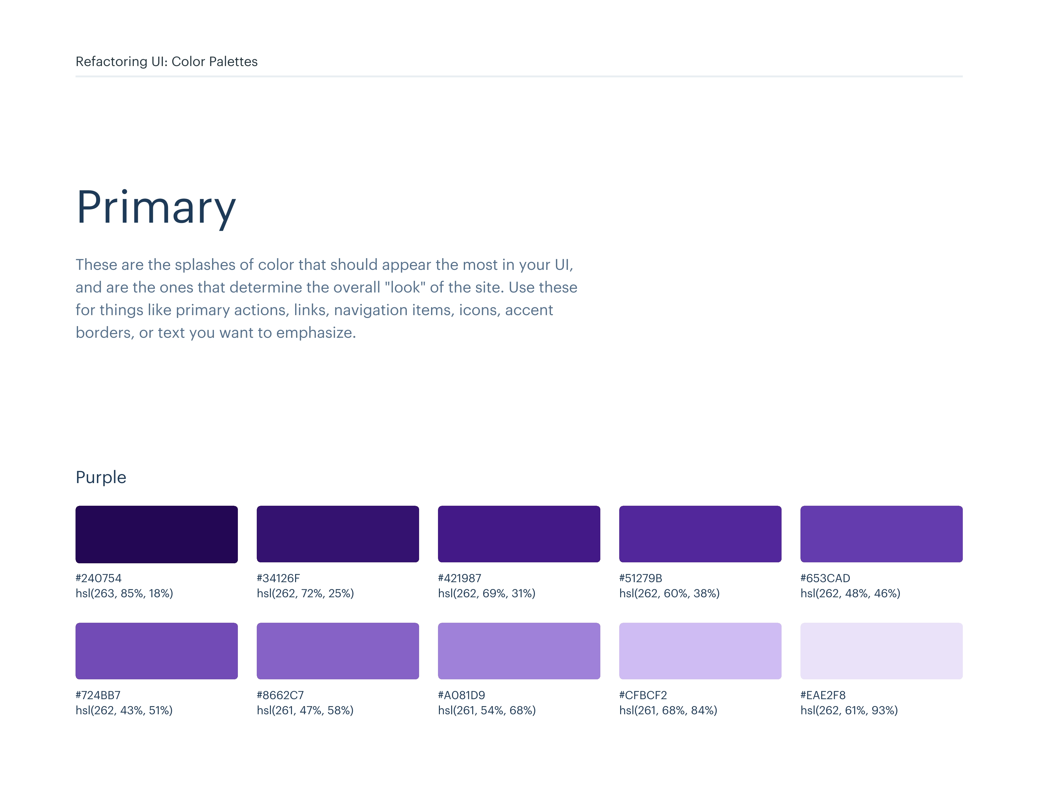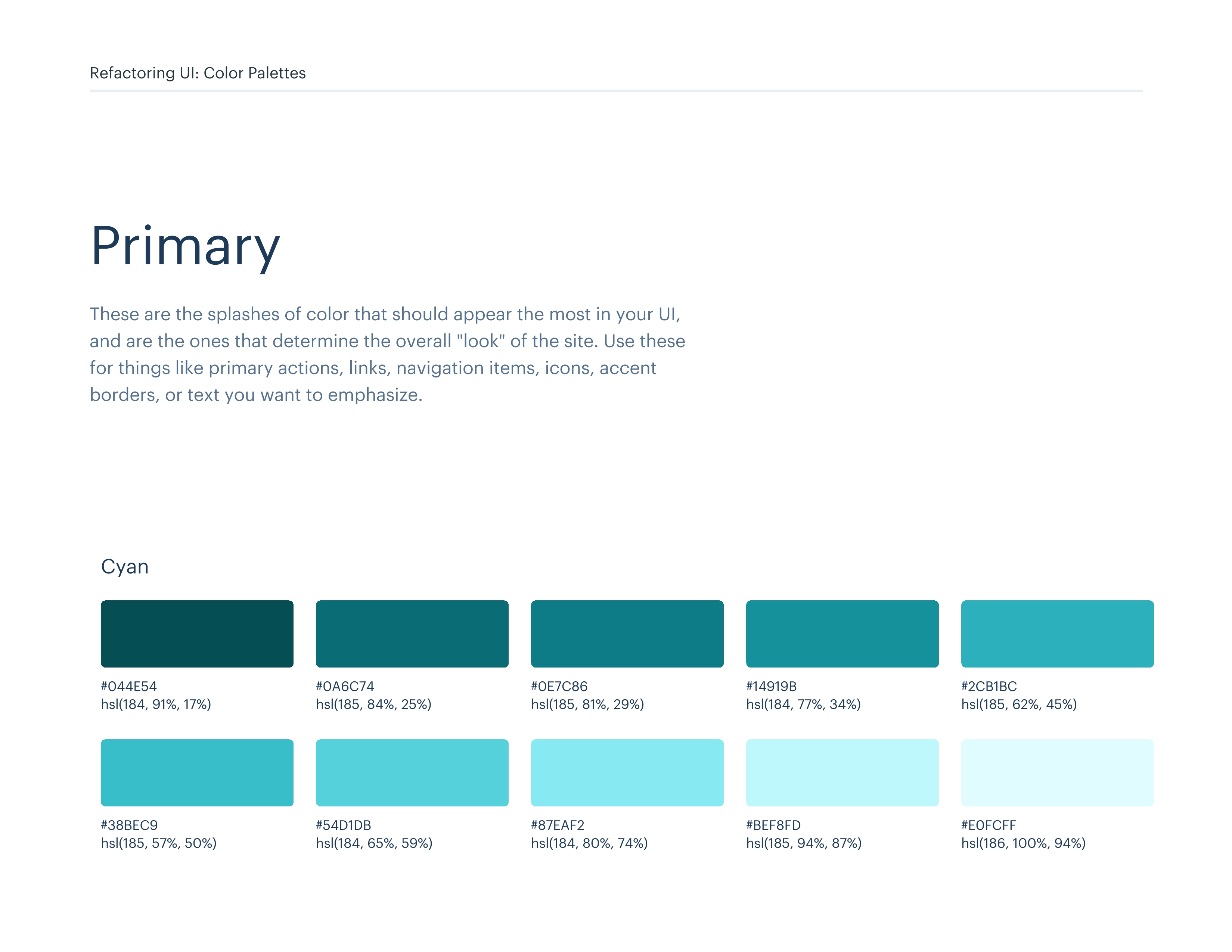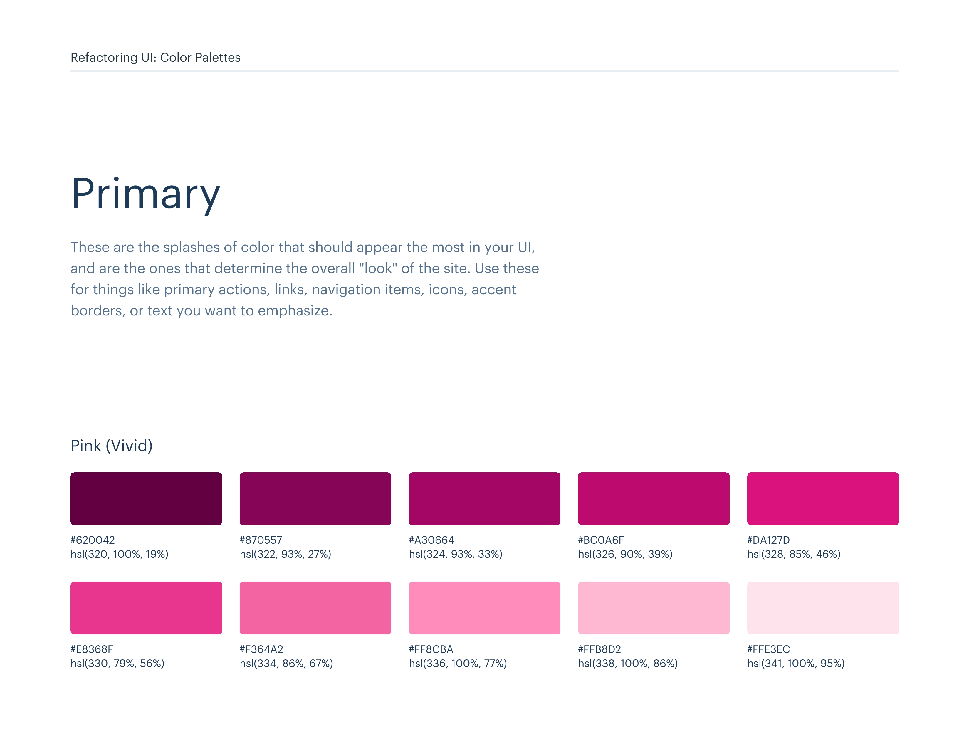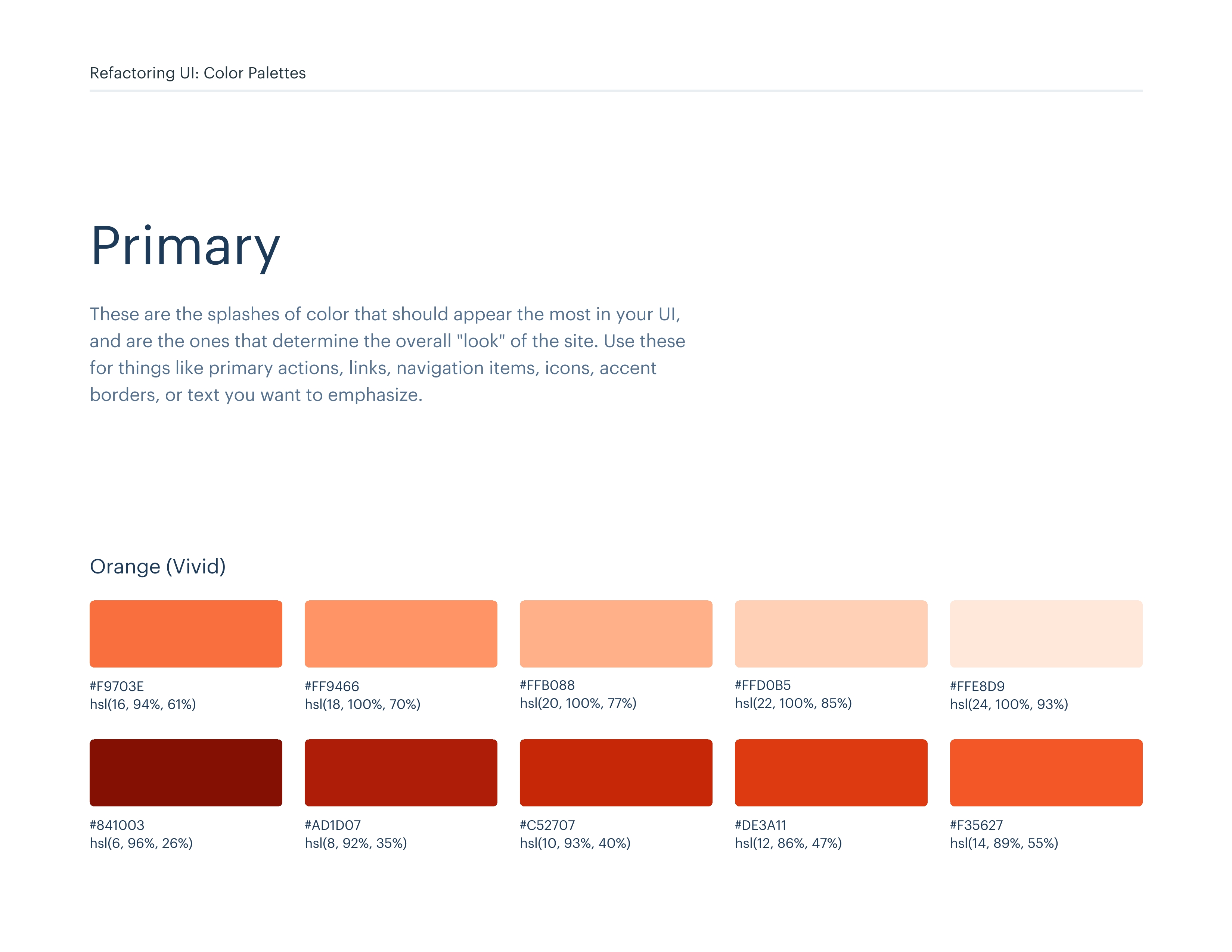 These are the splashes of color that should appear the most in your UI, and are the ones that determine the overall "look" of the site. Use these for things like primary actions, links, navigation items, icons, accent borders, or text you want to emphasize.