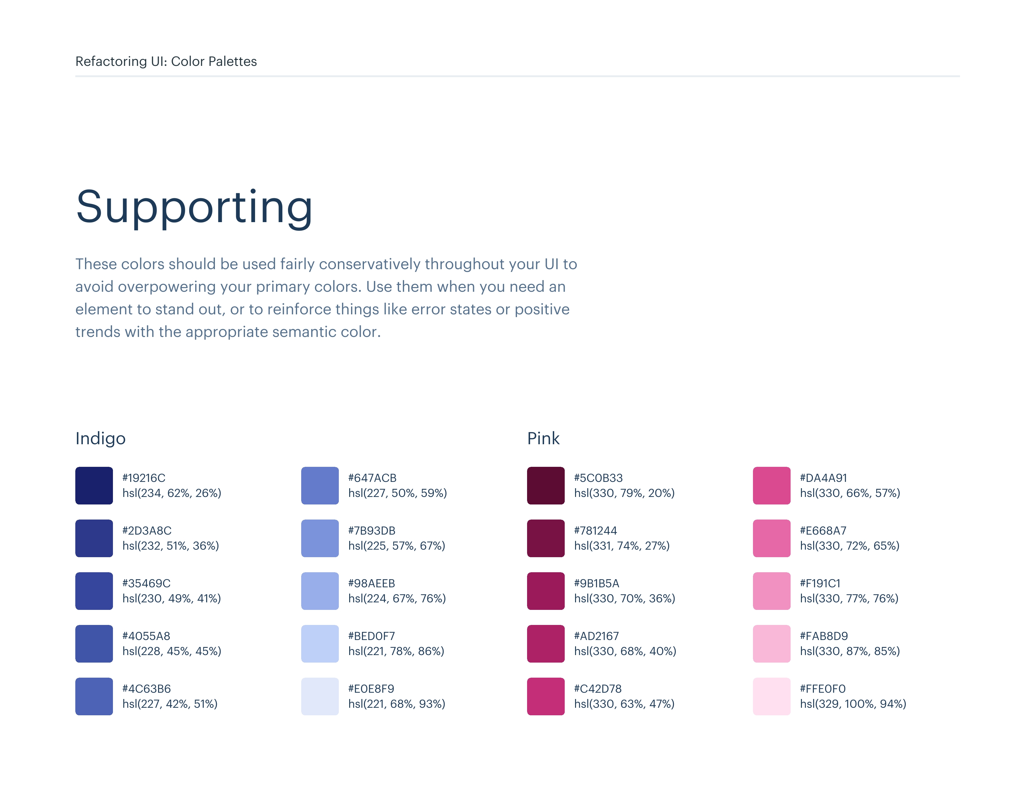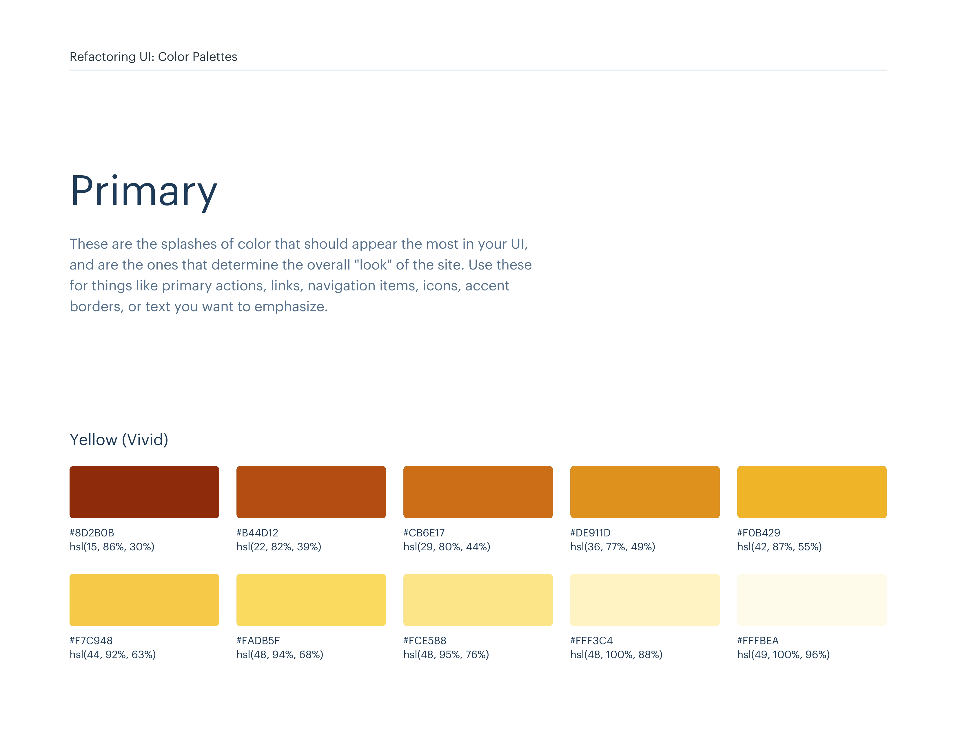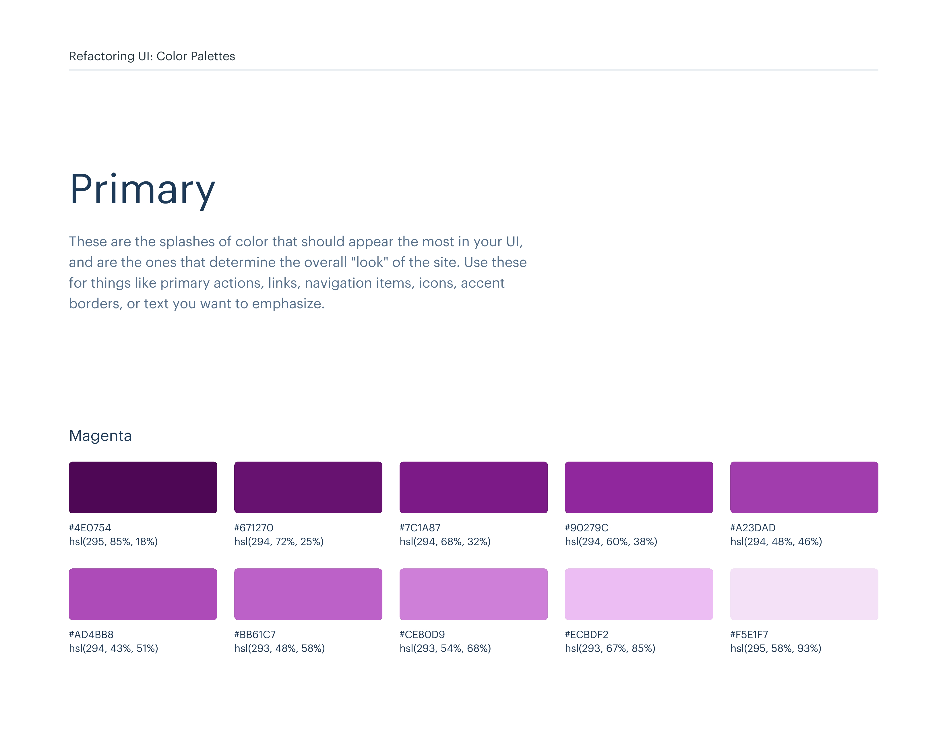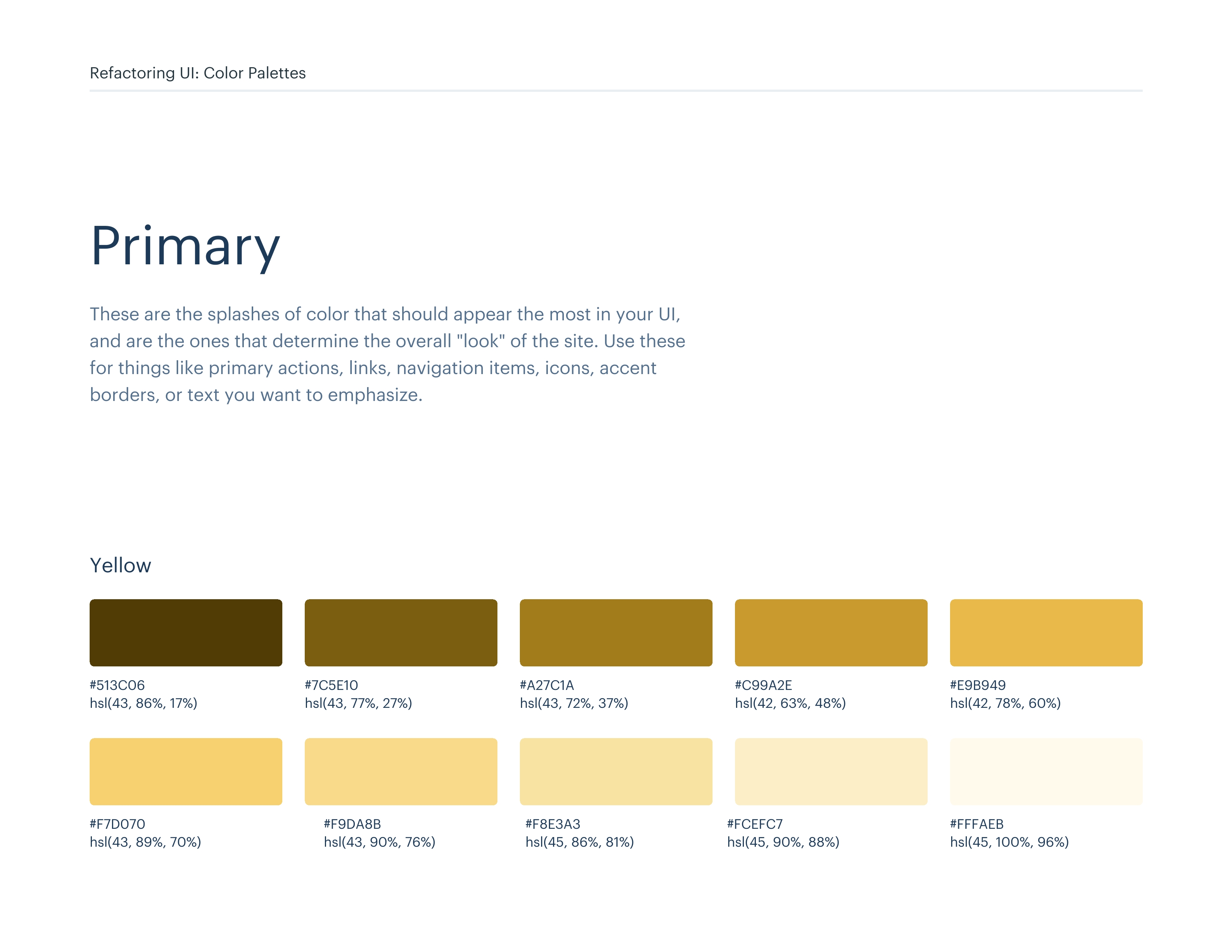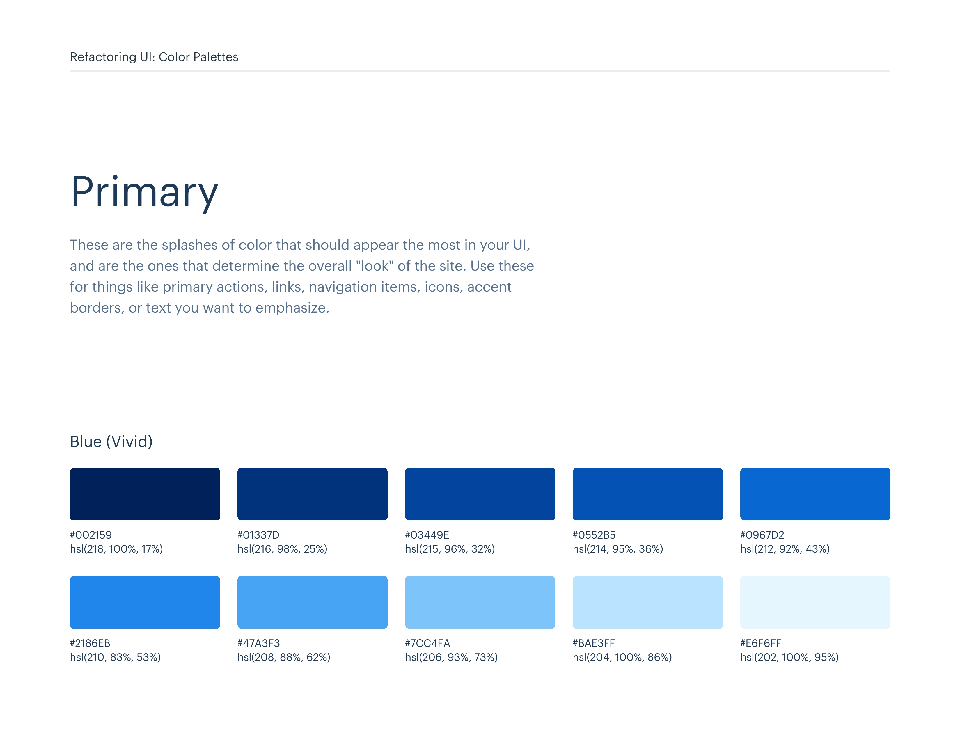 These are the splashes of color that should appear the most in your UI, and are the ones that determine the overall "look" of the site. Use these for things like primary actions, links, navigation items, icons, accent borders, or text you want to emphasize.