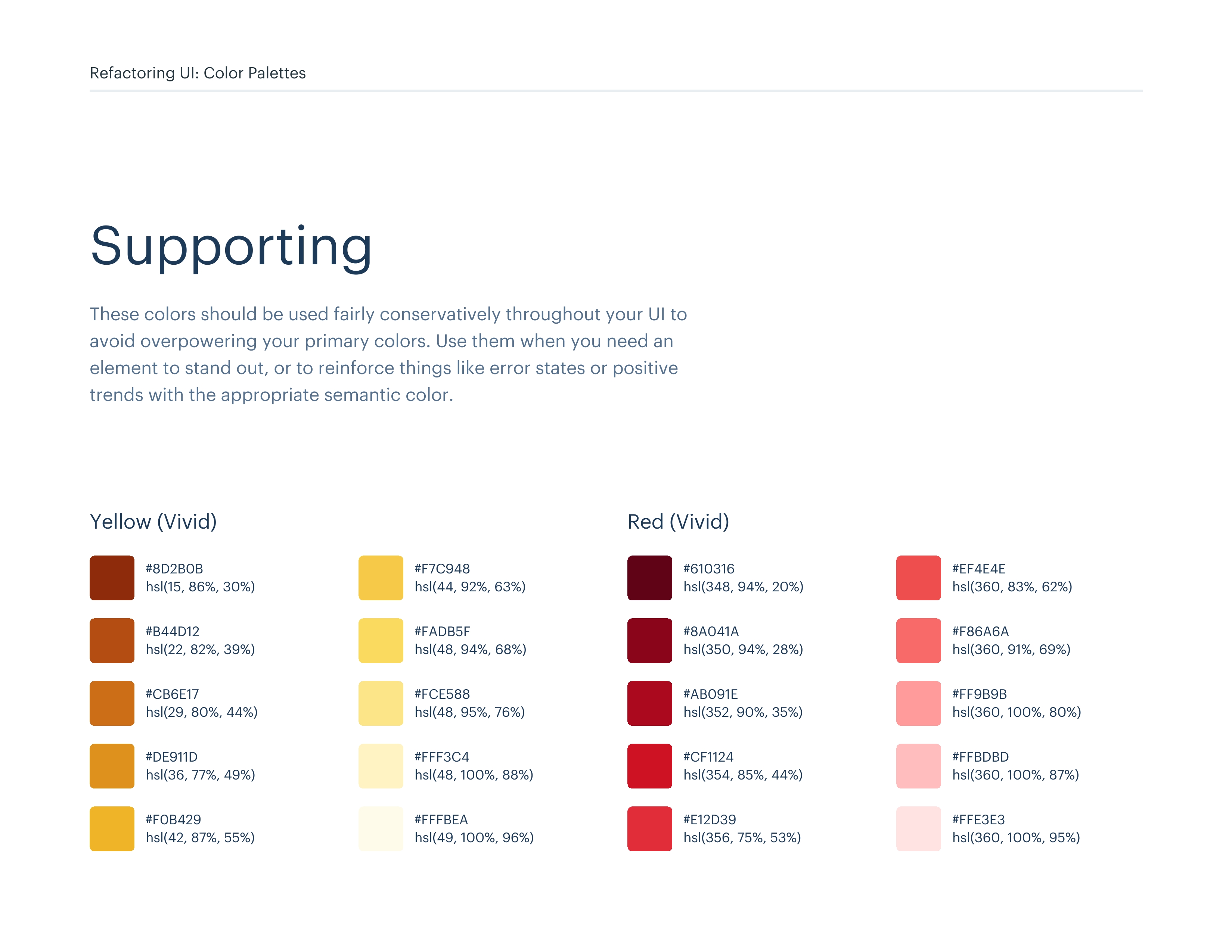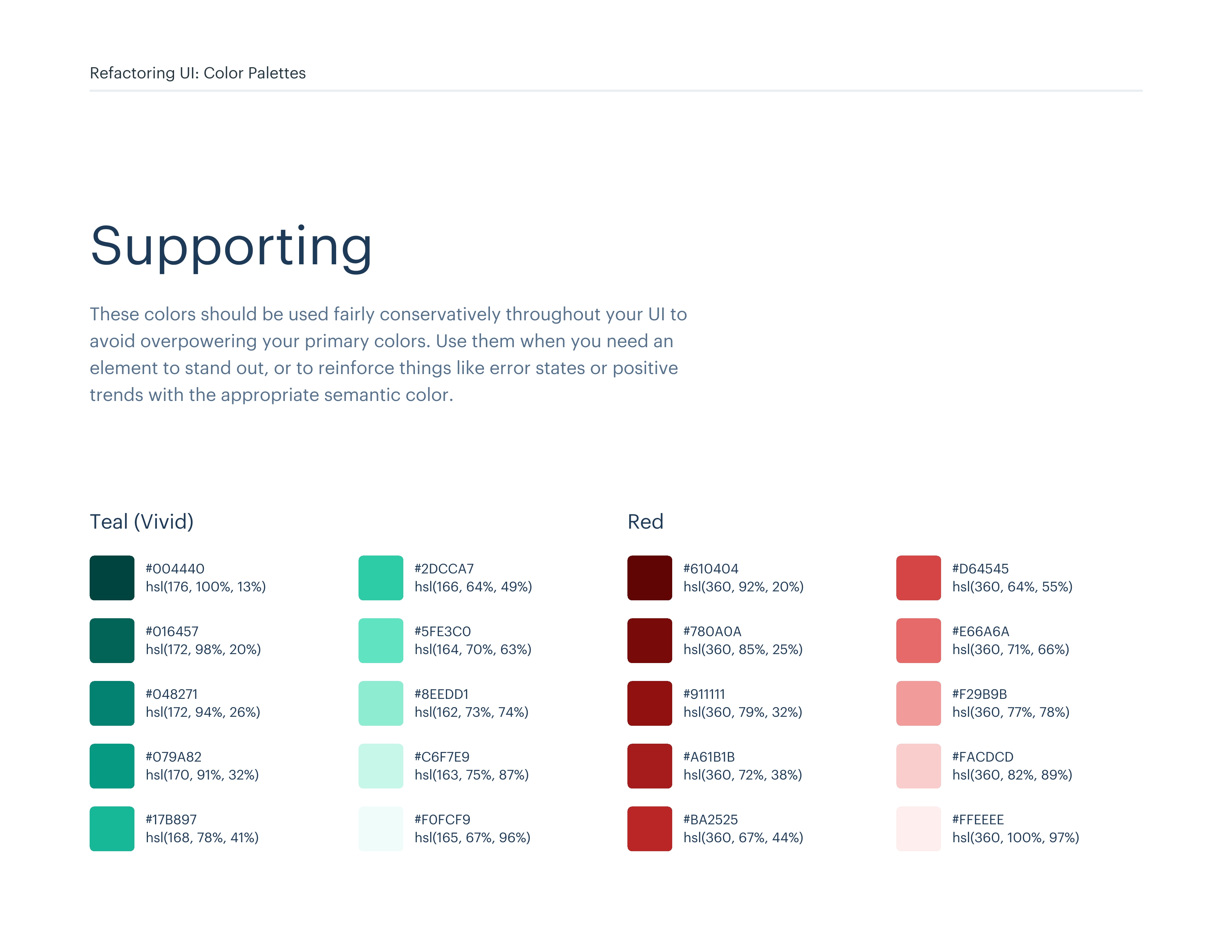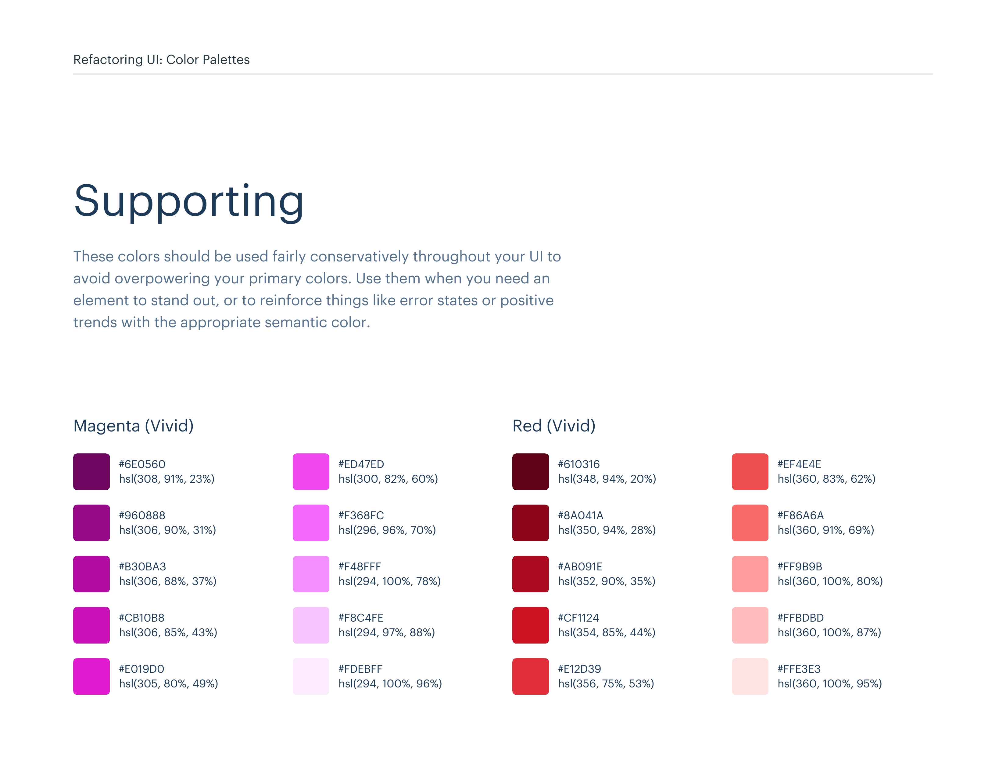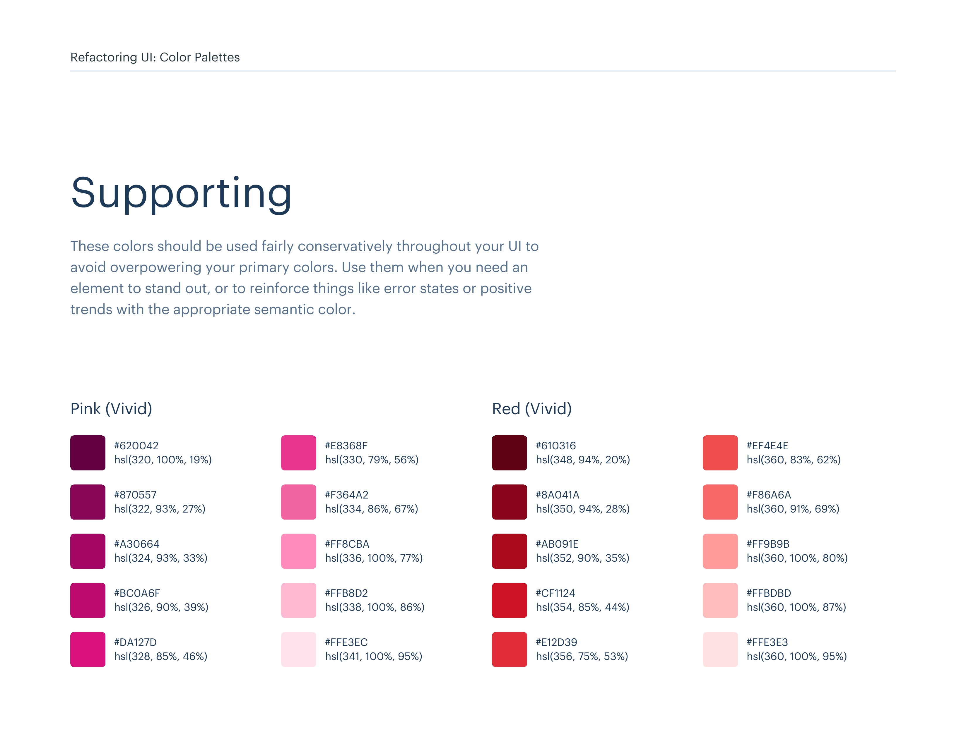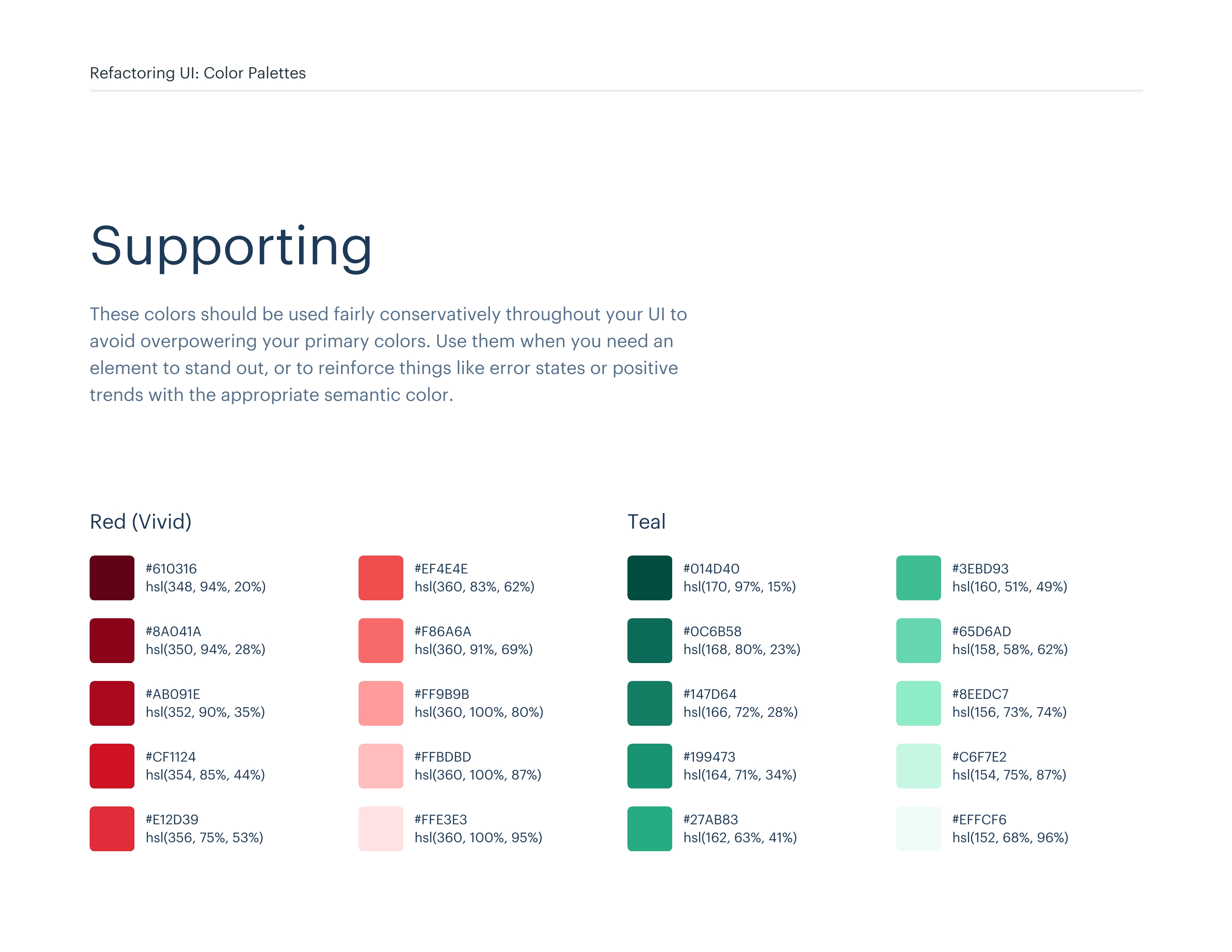 These colors should be used fairly conservatively throughout your UI to avoid overpowering your primary colors. Use them when you need an element to stand out, or to reinforce things like error states or positive trends with the appropriate semantic color.
