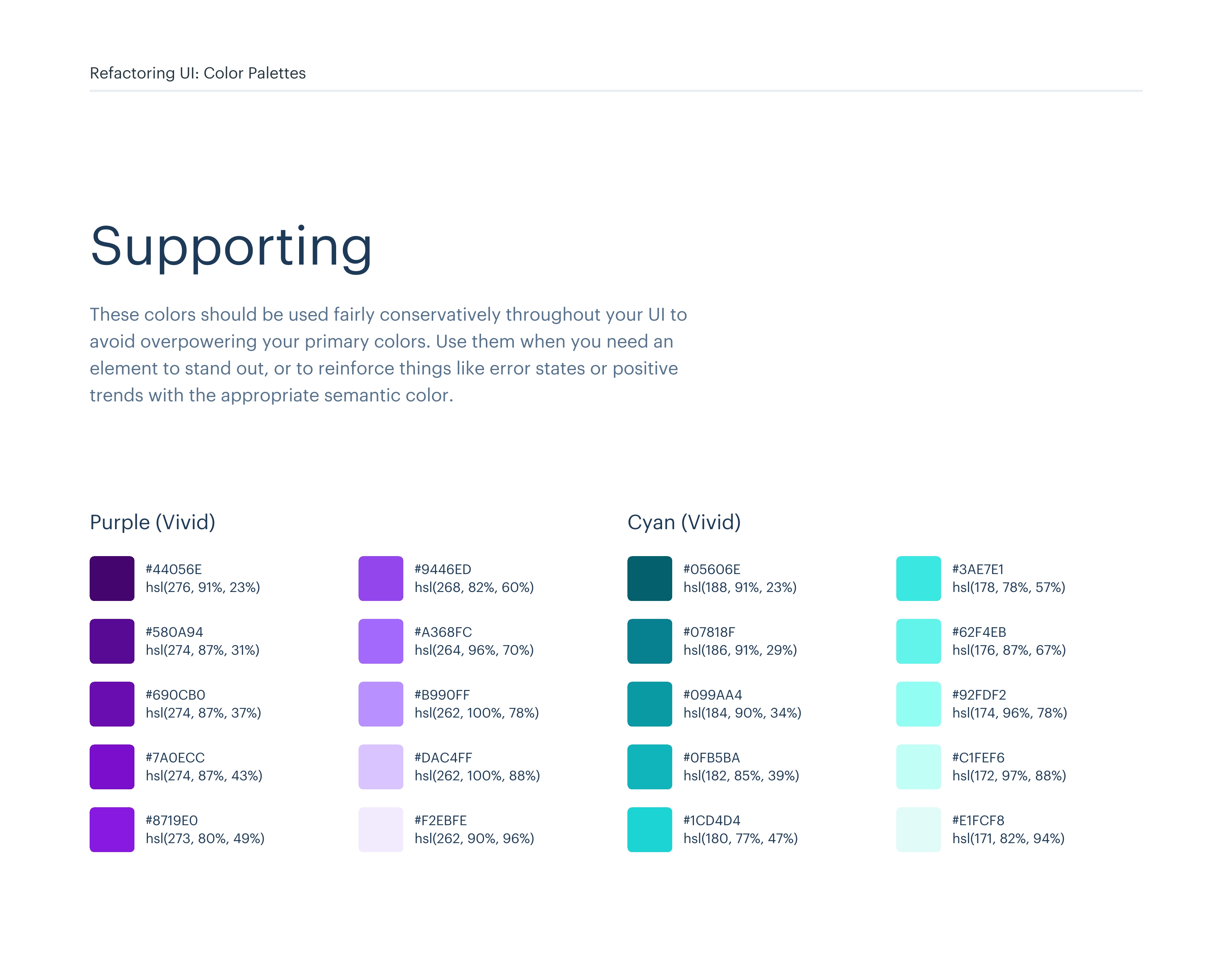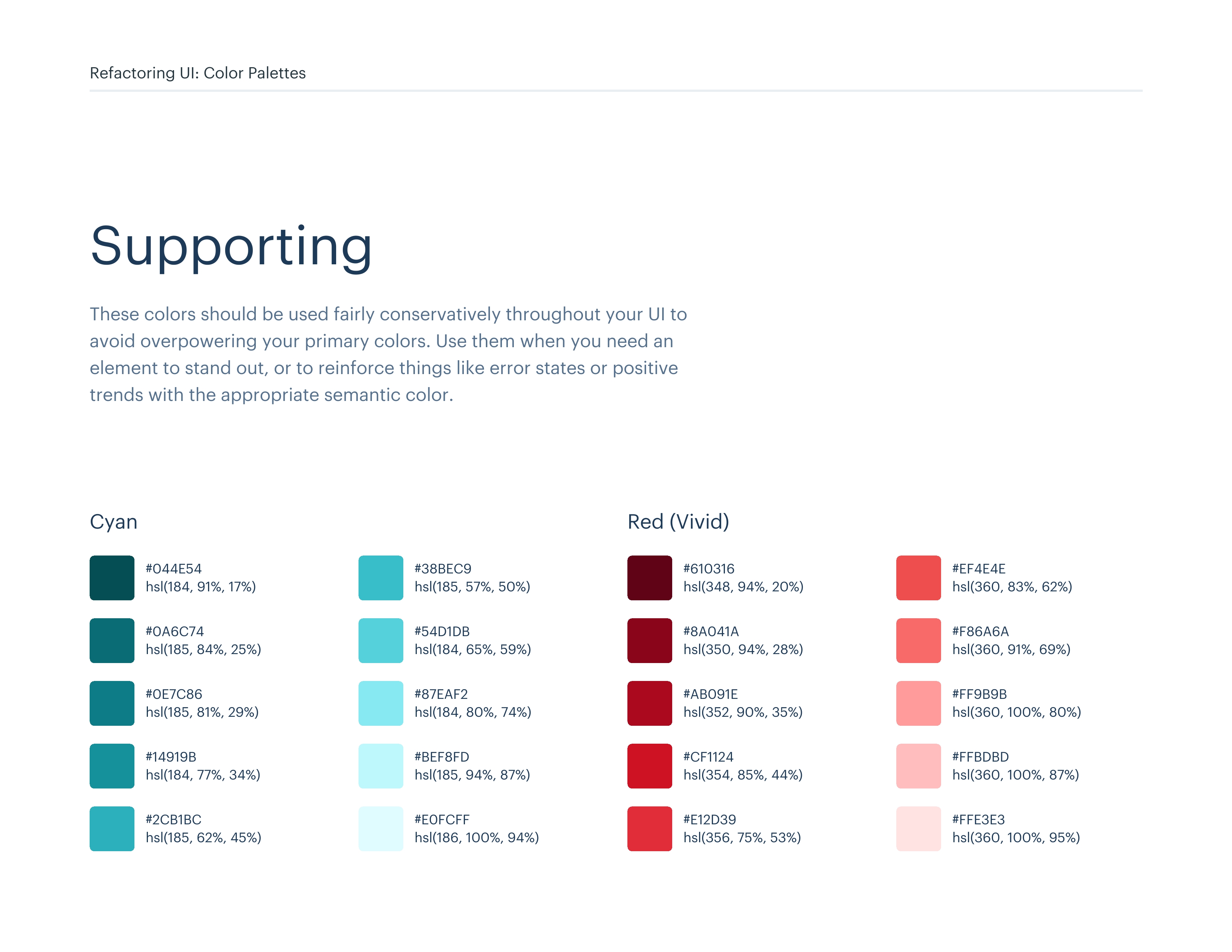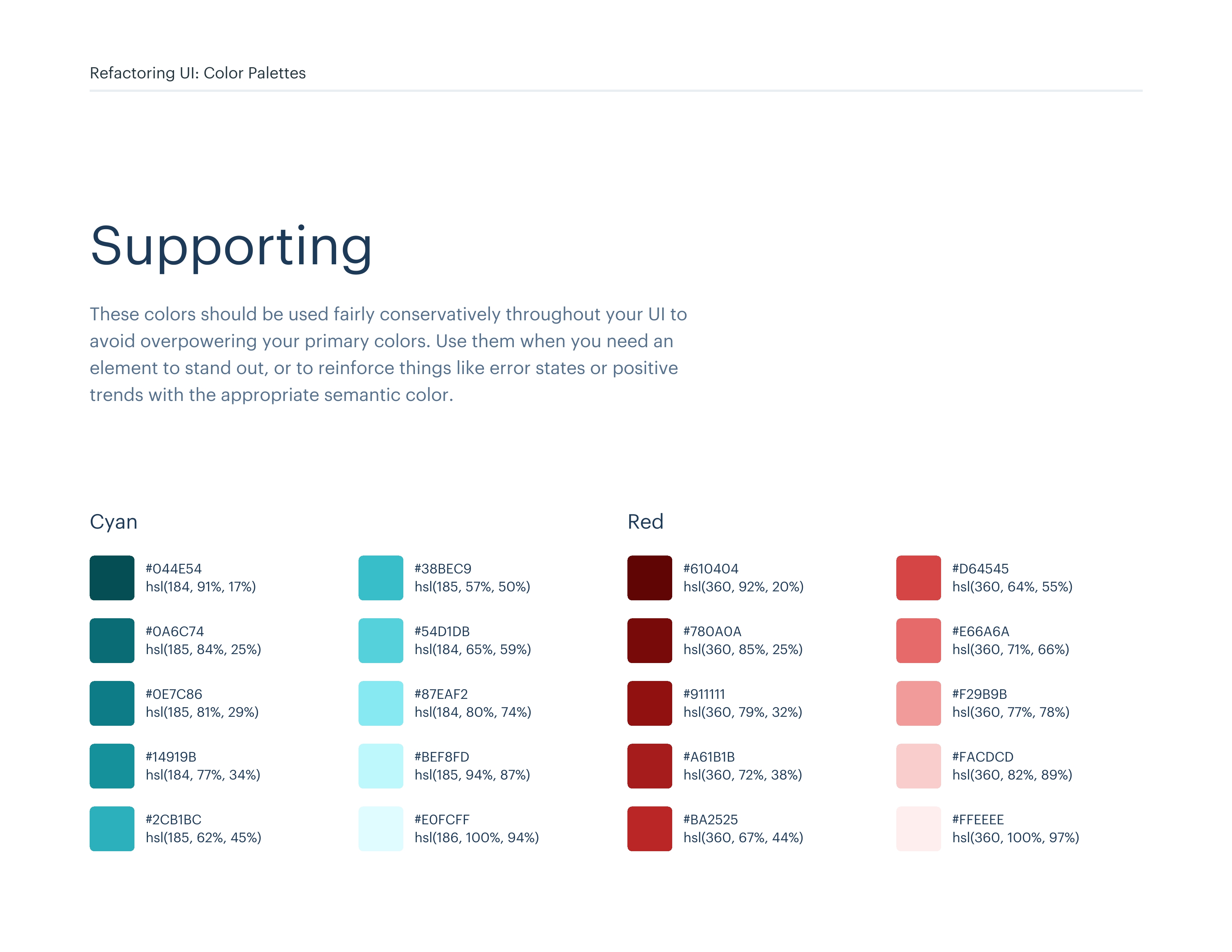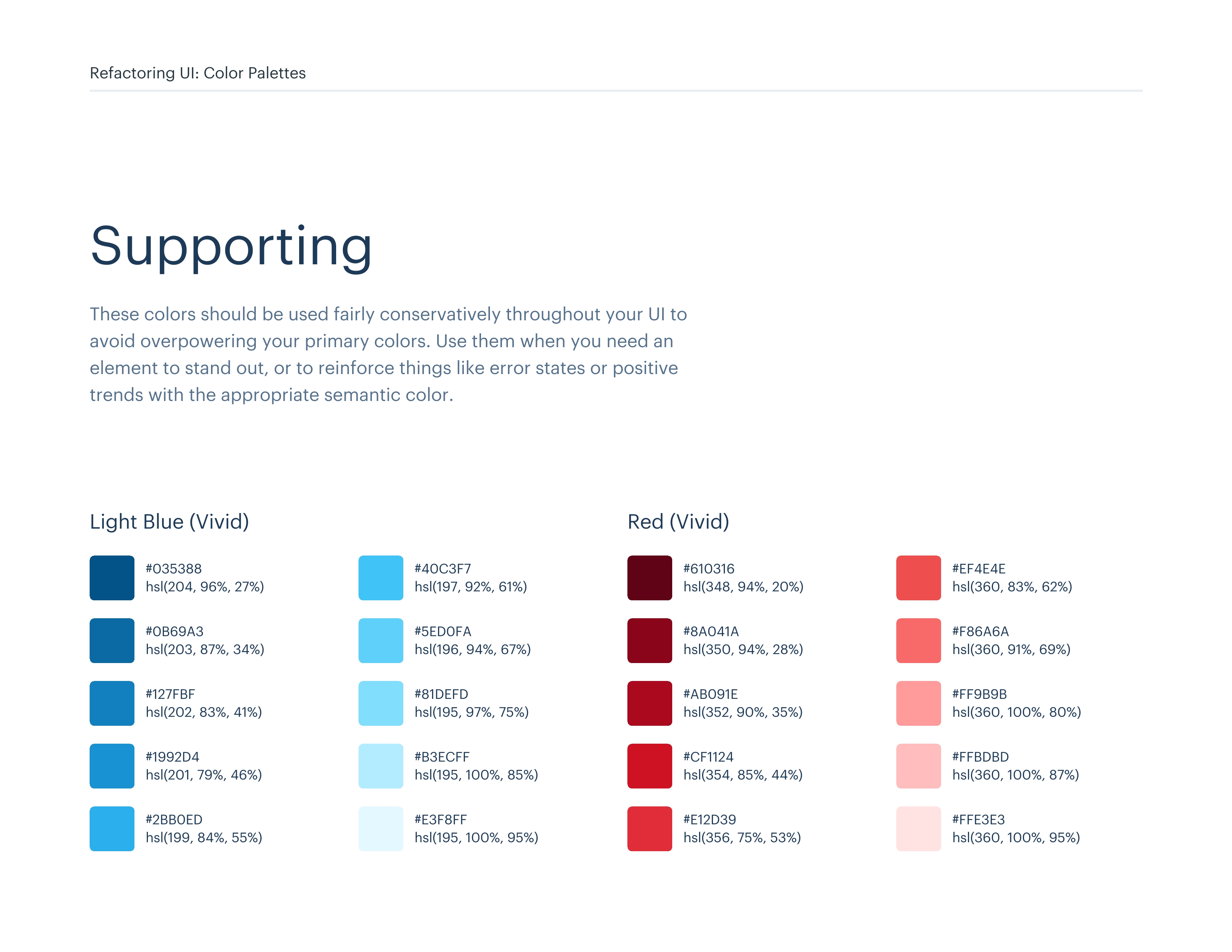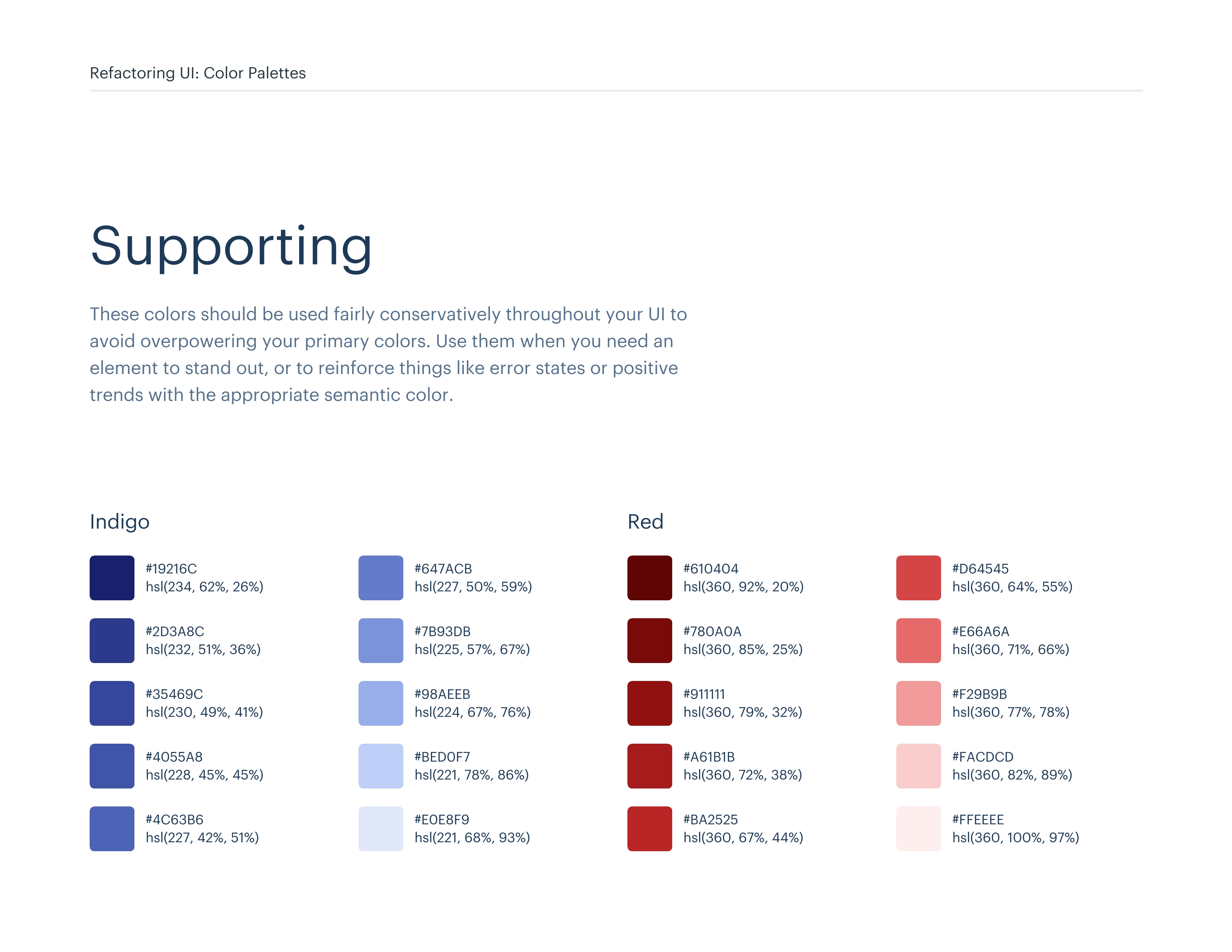 These colors should be used fairly conservatively throughout your UI to avoid overpowering your primary colors. Use them when you need an element to stand out, or to reinforce things like error states or positive trends with the appropriate semantic color.