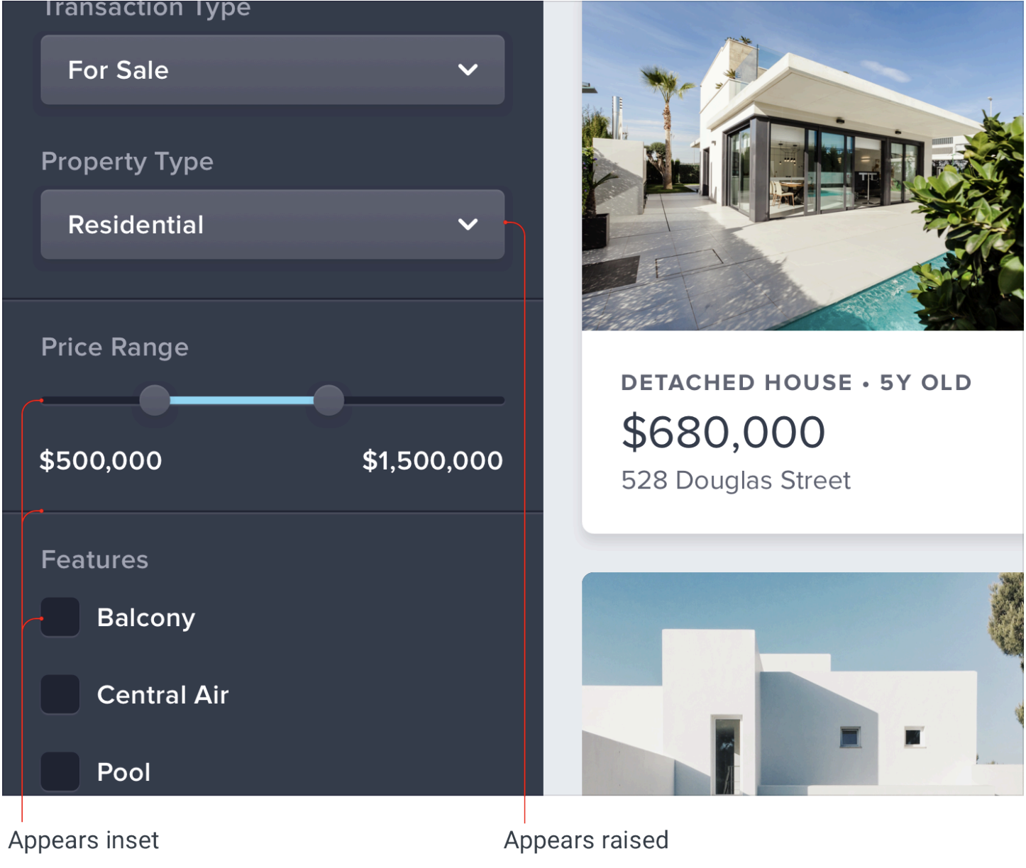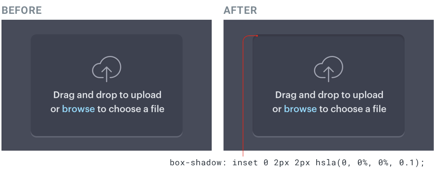 對於凹陷的效果,上方會擋住一些光線,所以要在頂部加一點陰影。這個陰影要稍微往下移一點,不要延伸到底部。這種方法很適合用在文字框和核取方塊等需要看起來凹進去的地方。