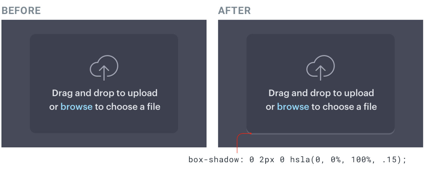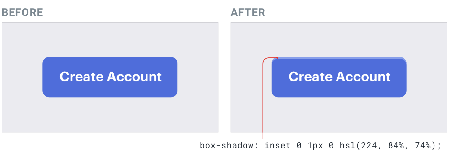 從上方看時,我們主要看到底部邊緣。因為這個邊緣朝上,所以要用底部邊框或內嵌陰影,並往上移一點點來讓它顯得更亮一些。