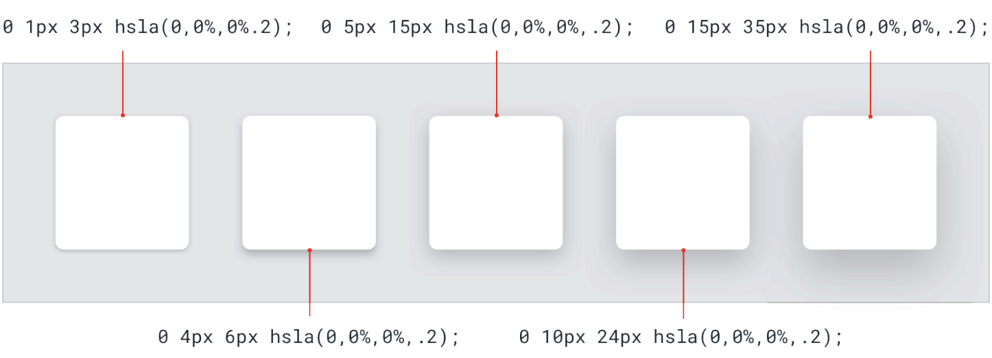 設計時,建議建立一套固定的陰影樣式:通常只需要5種不同大小的陰影,先定最小和最大的陰影,然後在中間新增3種漸變的陰影大小