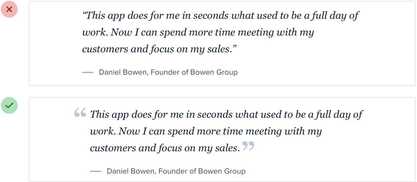 如果要展示使用者評價,可以把引號變得更醒目——把它變大或換個顏色就行: