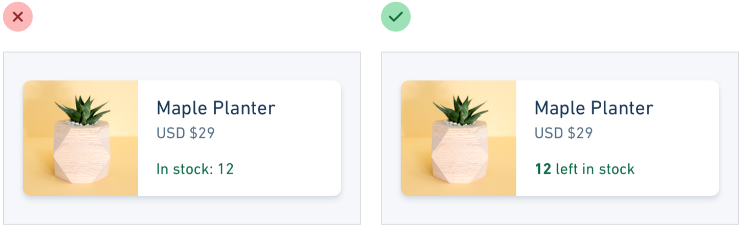 - 與其寫"庫存:12",不如寫"庫存僅剩12件"