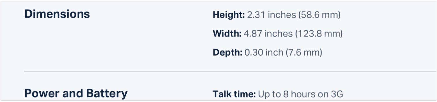在產品說明書這類資訊密集的頁面上,使用者可能會找特定資訊。比如找手機厚度時,他們會先看"厚度"這個詞,而不是具體數值"7.6毫米"。這時候標籤可以做得醒目一些,但數值也別太淡,畢竟這也是重要資訊。