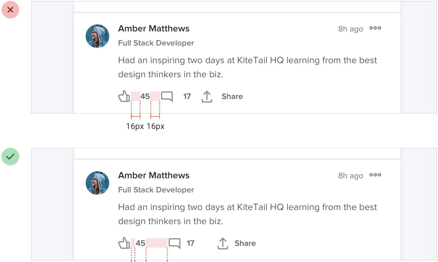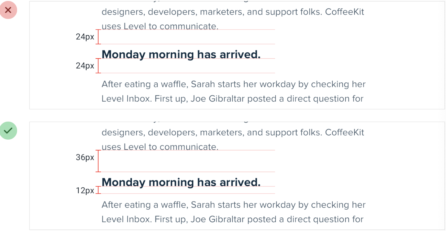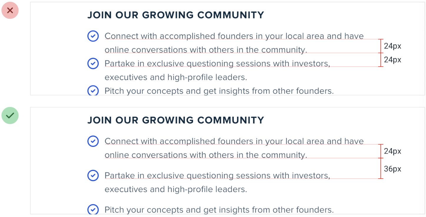 記住一個簡單的原則:當用間距來組織內容時,組與組之間的間距要比組內的間距大。這樣做能讓介面更清晰,更容易理解。