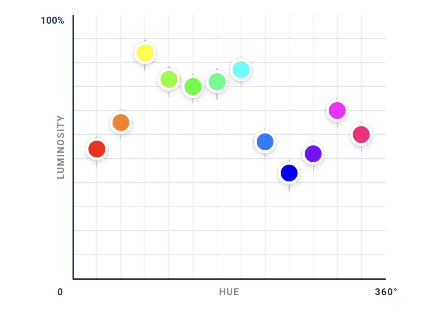 我們把所有顏色都設定成相同的飽和度(100%)和亮度(50%),然後觀察不同顏色的樣本,這樣就能看出人眼對不同顏色的亮度感知有什麼不同。