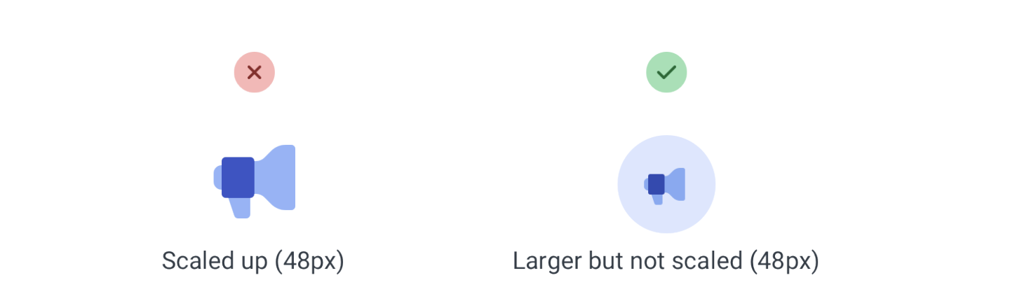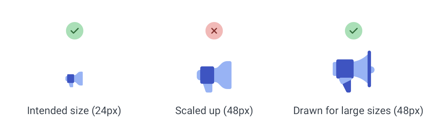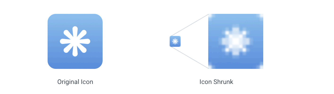 但事實是,原本設計用於16-24畫素的小圖示,放大3-4倍後會看起來很不專業。這些放大的圖示會顯得粗糙,比例失調。