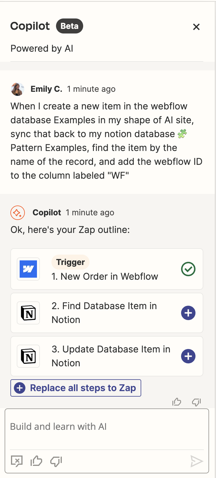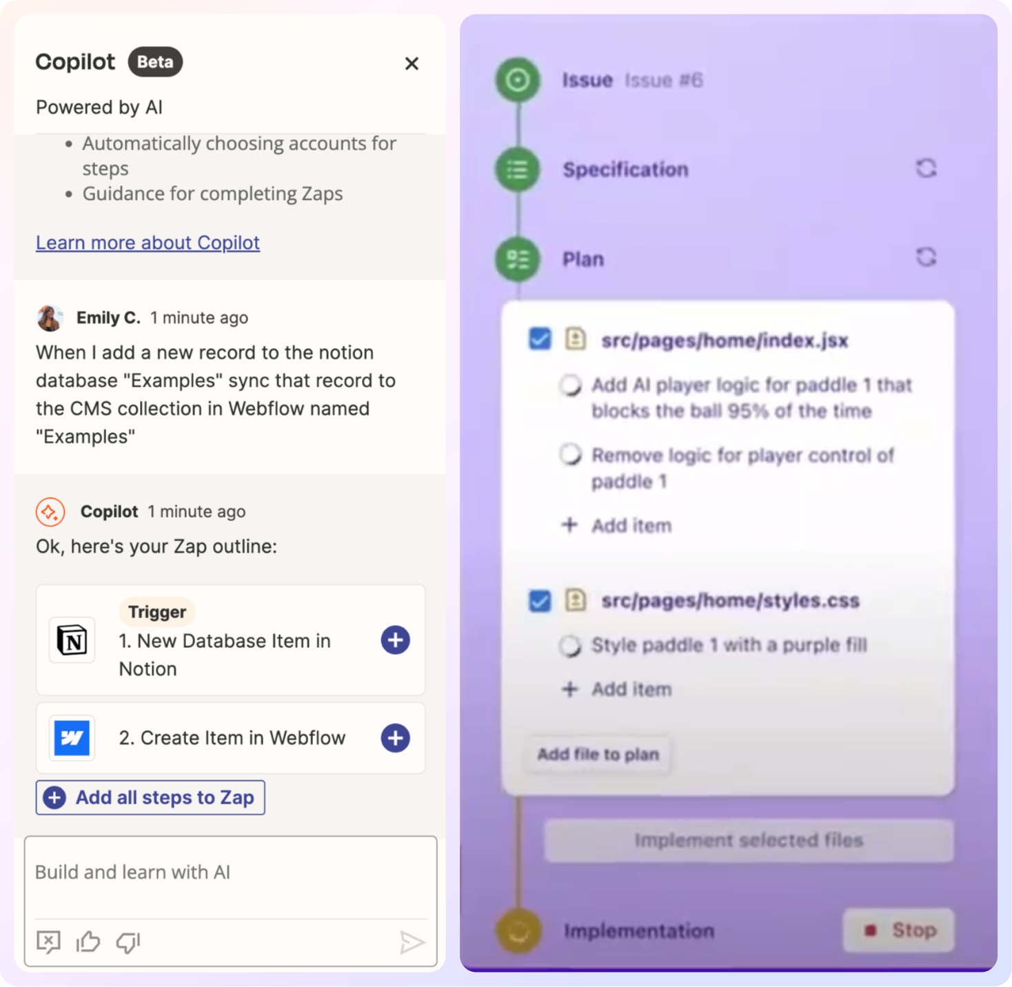 - 使用者確認機制:在執行潛在高風險任務時(如修改程式碼、觸發自動化工作流),AI 在執行前展示步驟並徵求使用者確認。示例:Github Copilot 顯示將修改的檔案和影響範圍,Zapier 則展示 AI 驅動的 Zaps 工作流程。