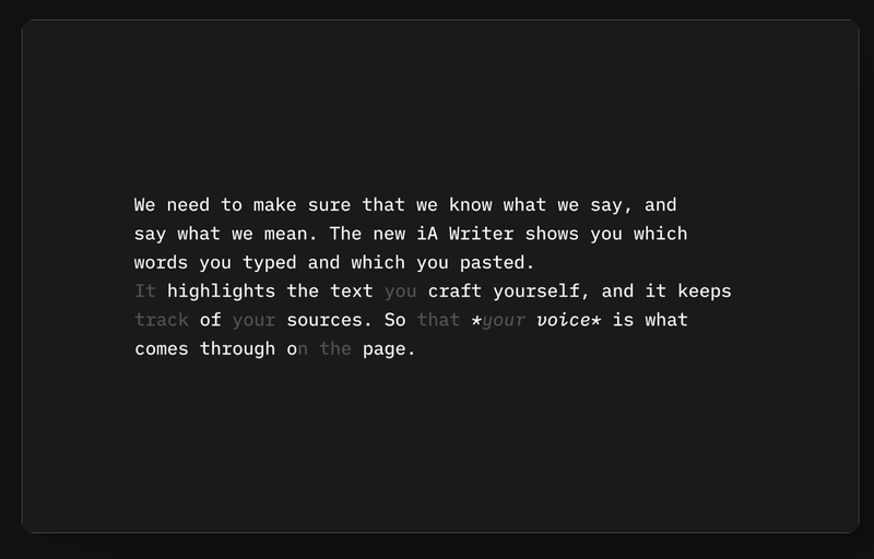 示例:IA Writer 使用灰色標記 AI 生成文字,使用者修改後的內容則恢復為標準高對比度顏色。