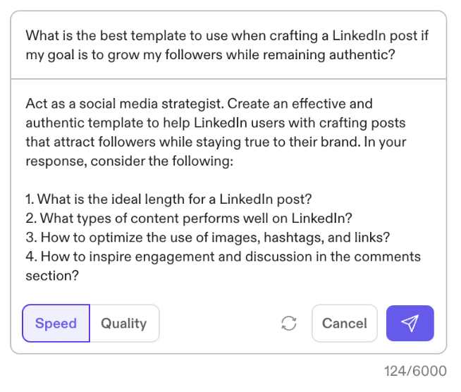 - 例如,Jasper 提供簡潔的選項,允許使用者在生成速度和質量之間快速切換。