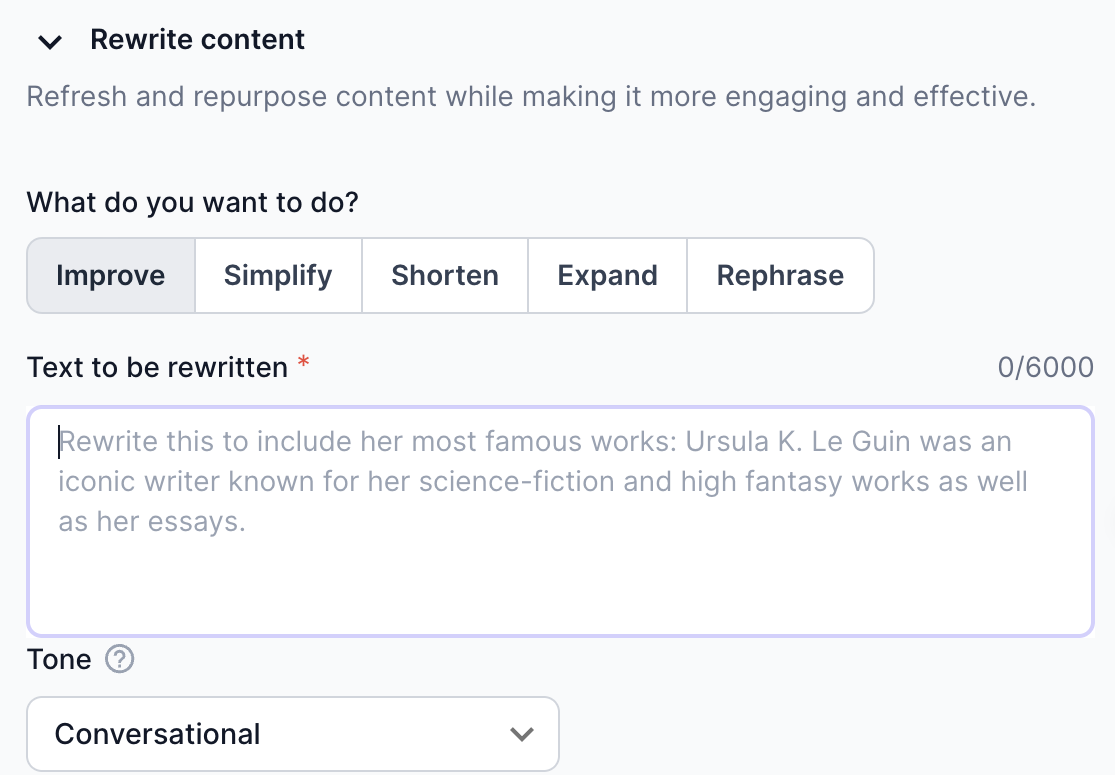 - 調整語氣(如正式/幽默)、寫作風格(敘述性/說明性)或內容複雜度。