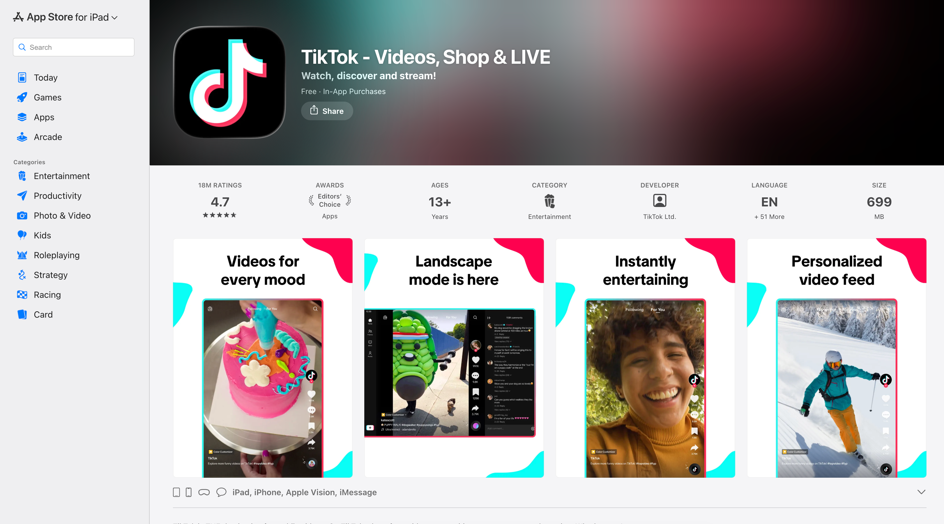 App 詳情頁進行了“大屏友好型重構”:新增豐富的多媒體卡片(影片、截圖、活動預覽)、更直觀的分類標籤、獎項圖示與清晰的內容層級,使產品資訊展示更沉浸、更結構化。