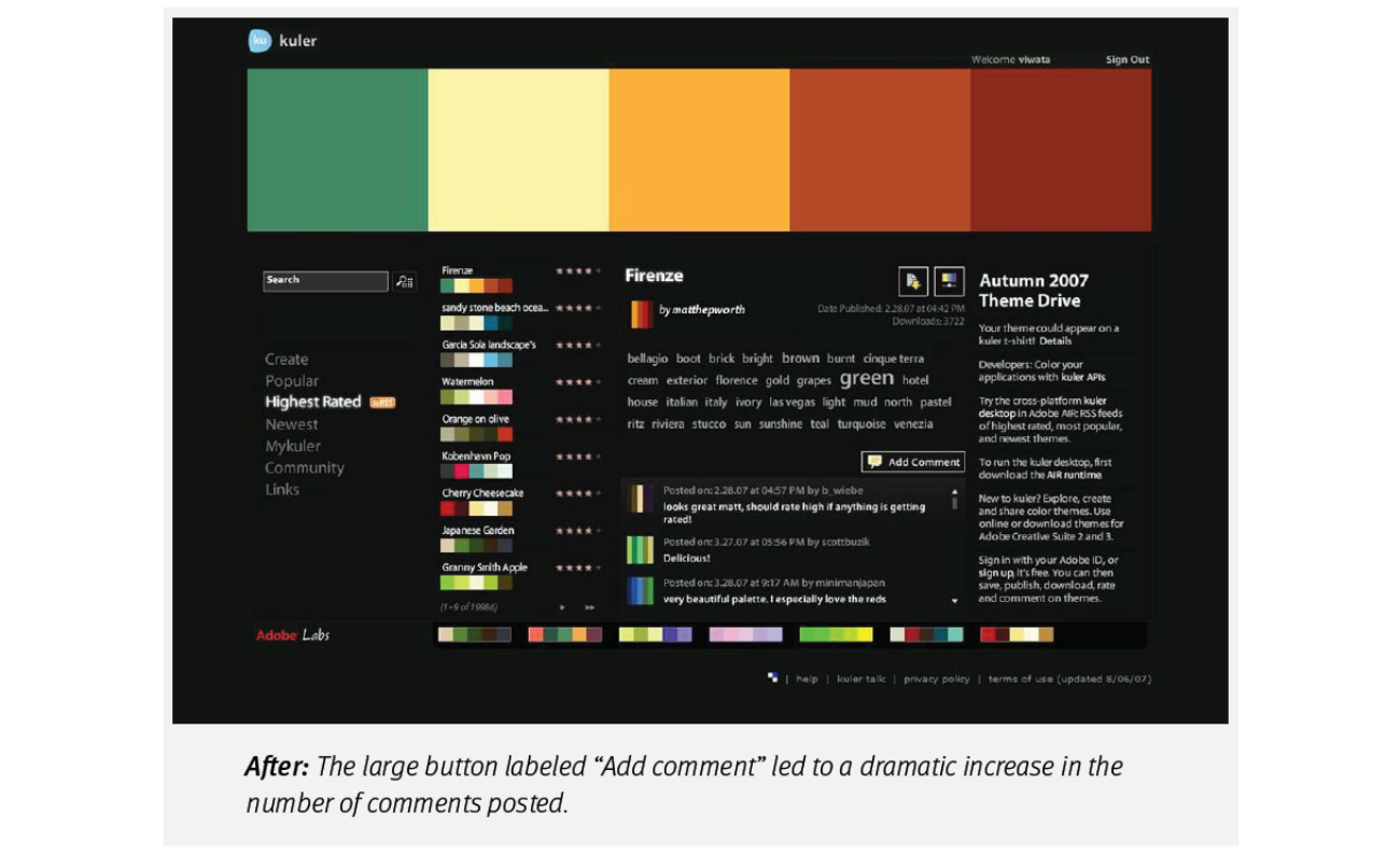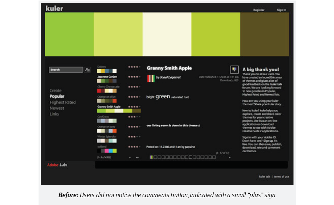 那時候,它還叫 Adobe Kuler(現在叫 Adobe Color),是一個讓創作者線上分享和交流配色方案的Flash網站。大家可以上傳自己設計的配色、評分、下載,用在網頁、室內、插畫等各種專案裡。