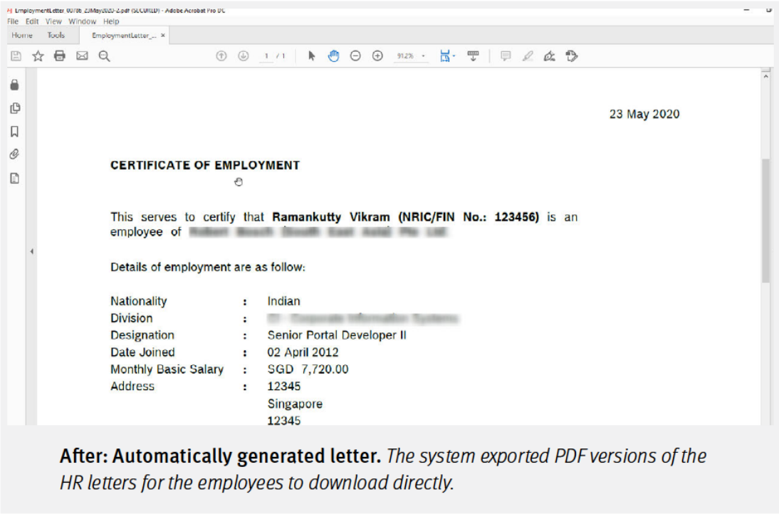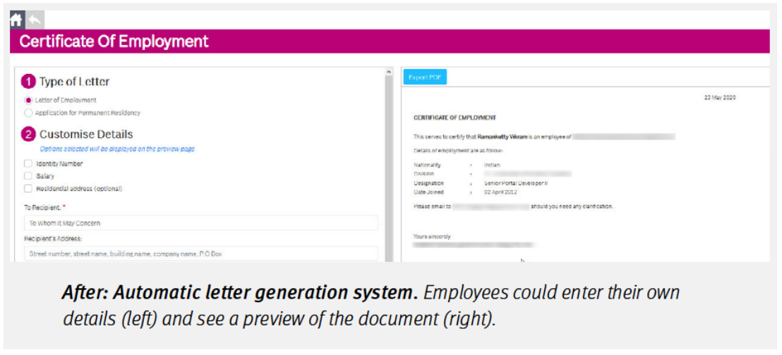 我們下的決心也很簡單:必須自動化。我們先跟HR一起列出最常開的幾類信,比如Employment Certificate、Salary Certificate這類標準格式,然後我們在系統裡設計了一個模組,讓員工自己選信的型別,填上基本資訊,比如員工編號,系統就能自動調出他的職位、入職時間、部門、工資等等,套用官方模板生成PDF。當場預覽、當場下載,幾分鐘內就能拿到,而且是蓋章版的,不用等HR審批。