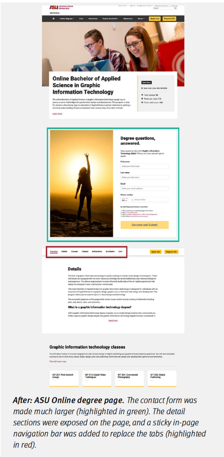 Amanda Gulley 在覆盤中明確指出了這個權衡:“我們要的不是更多表單提交,而是更有意圖的使用者。”所以EdPlus團隊決定,下一輪改版的重點將不是繼續追求表單效率,而是重新最佳化資訊傳遞順序,讓真正關心內容的使用者留下來,並在瞭解充分後再決定是否聯絡招生團隊。