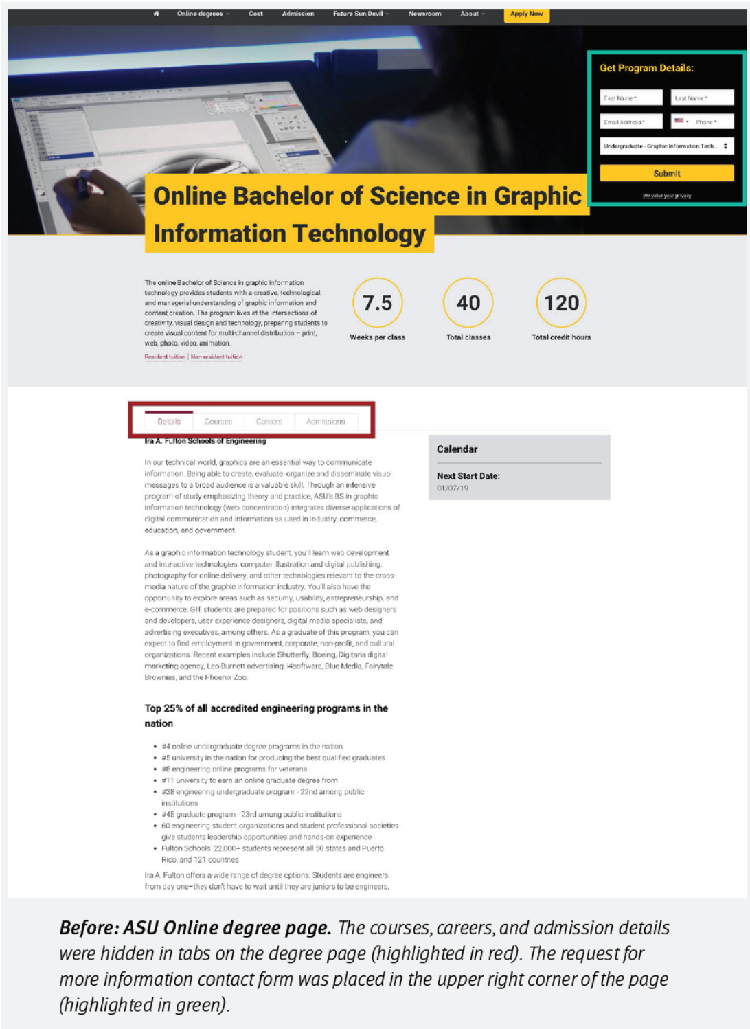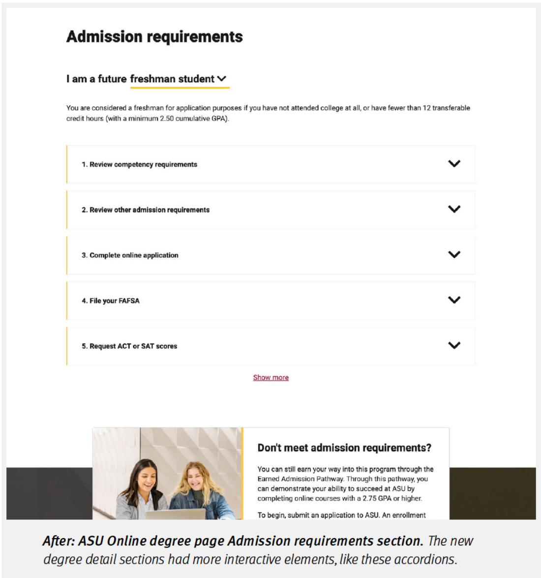 當時我們協助的是 Arizona State University Online,也就是ASU Online,專案聚焦在他們的網站學位資訊頁面上。這個頁面其實是每個潛在學生了解自己未來課程、職業方向、申請要求、學費計算等關鍵資訊的核心入口。說實話,這些頁面對招生能不能轉化,起著決定性作用。