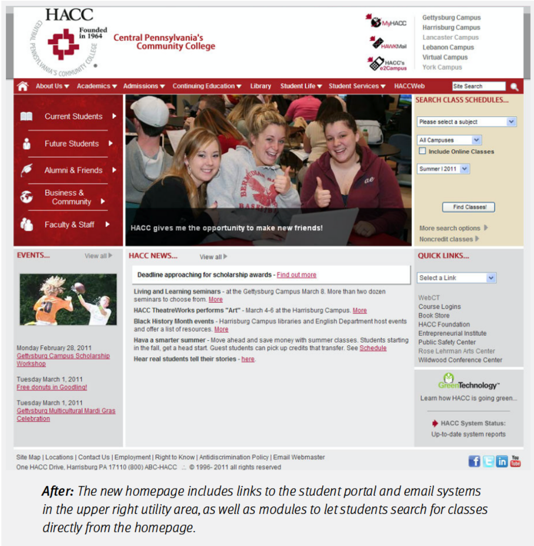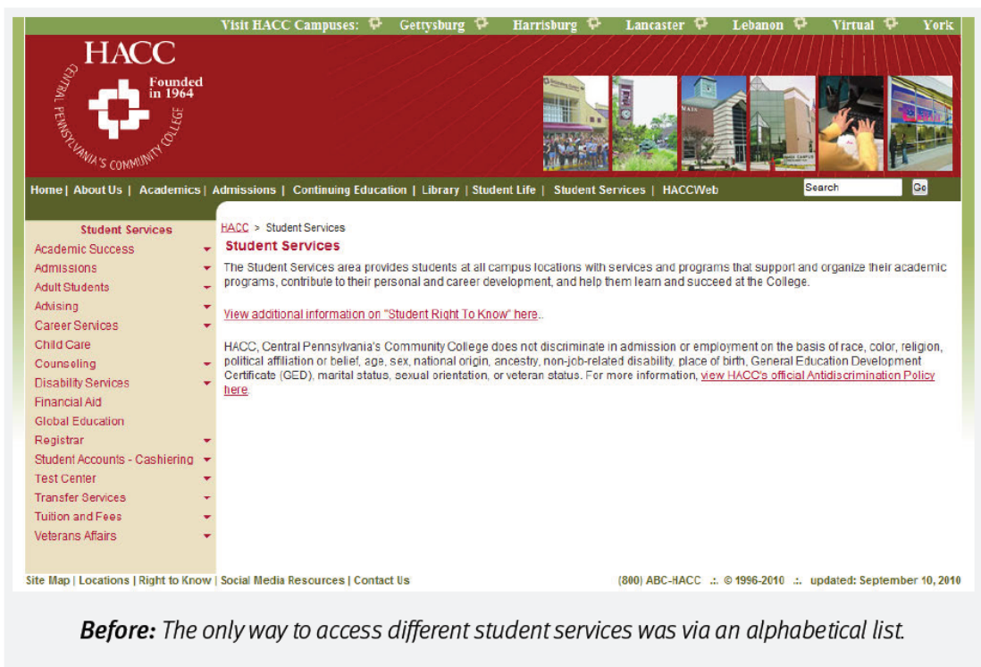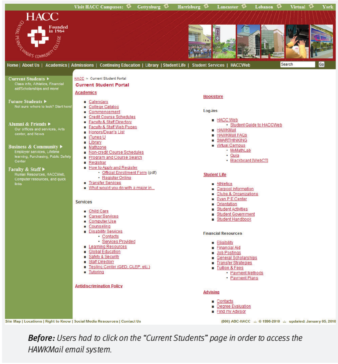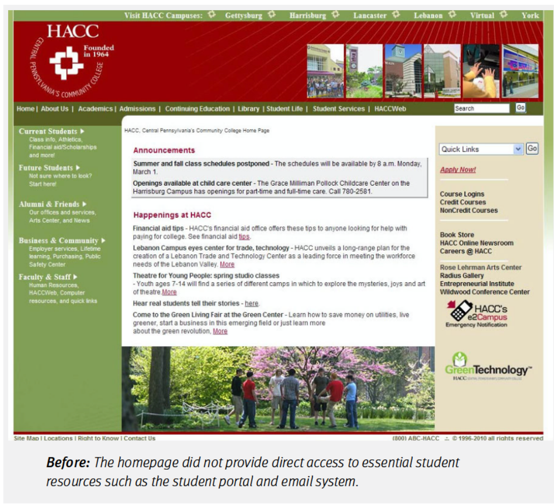 在美國賓夕法尼亞州,有一所服務超過兩萬名學生的大學,名叫 Harrisburg Area Community College(簡稱 HACC)。他們的官網承載著學生註冊、檢視課程、檢視日曆、查收郵件等眾多功能——但不知為何,這個網站長年都不溫不火,尤其首頁,根本稱不上“學生的入口”。