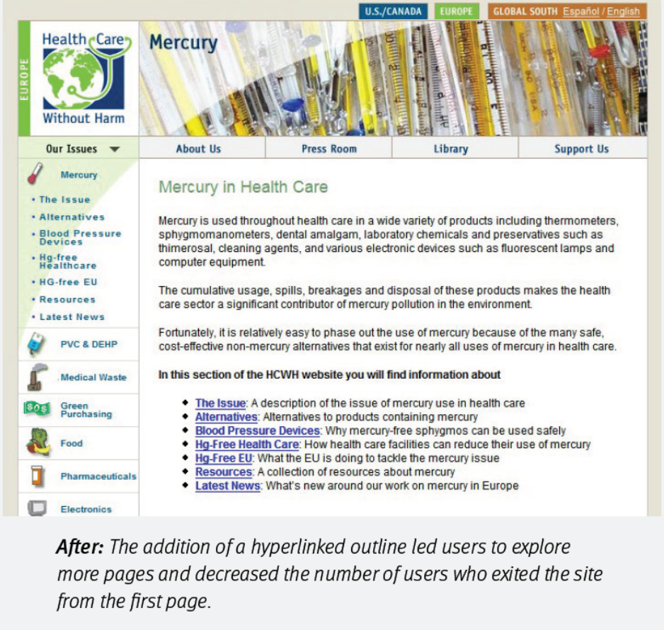 設計師決定做一個小實驗。他們沒有直接全站改版,而是挑選了一個議題頁面做區域性最佳化。他們把原本“寫得很長”的文字介紹換成了一個結構更清晰的頁面摘要,並新增了一個 超連結目錄,直接把使用者引導到具體子頁面,比如“解決方案”、“研究資料”、“技術替代方案”等等。