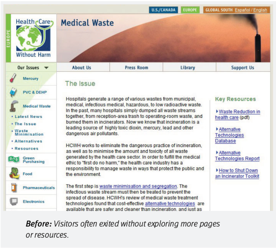 Health Care Without Harm 是一個關注醫療行業可持續性的非營利組織網站,致力於推廣更安全的產品和實踐。它的內容非常豐富,涵蓋了醫療廢物、食品汙染、綠色採購等10個關鍵議題,每個主題下都有很多深度文章和資源連結。