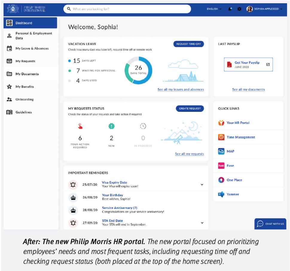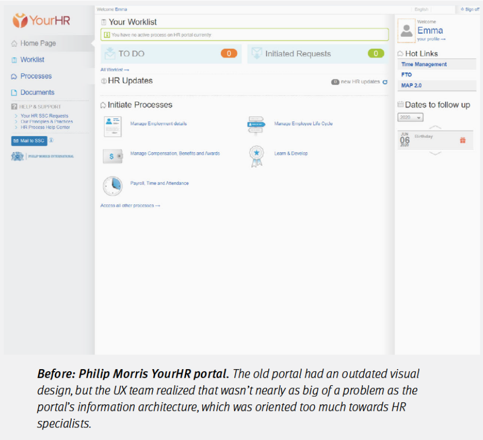 這個HR門戶叫 YourHR,是PMI全球員工每天都在用的內部工具,用來看工資單、請假、查進度……但原來的介面雖然五花八門,真正大家常用的功能,卻都藏在不顯眼的地方。這個系統一開始就是為HR專員量身打造的,資訊架構也圍繞HR的流程來設計,結果導致普通員工連“我要請假”這種最基礎的事,都得找HR打電話。