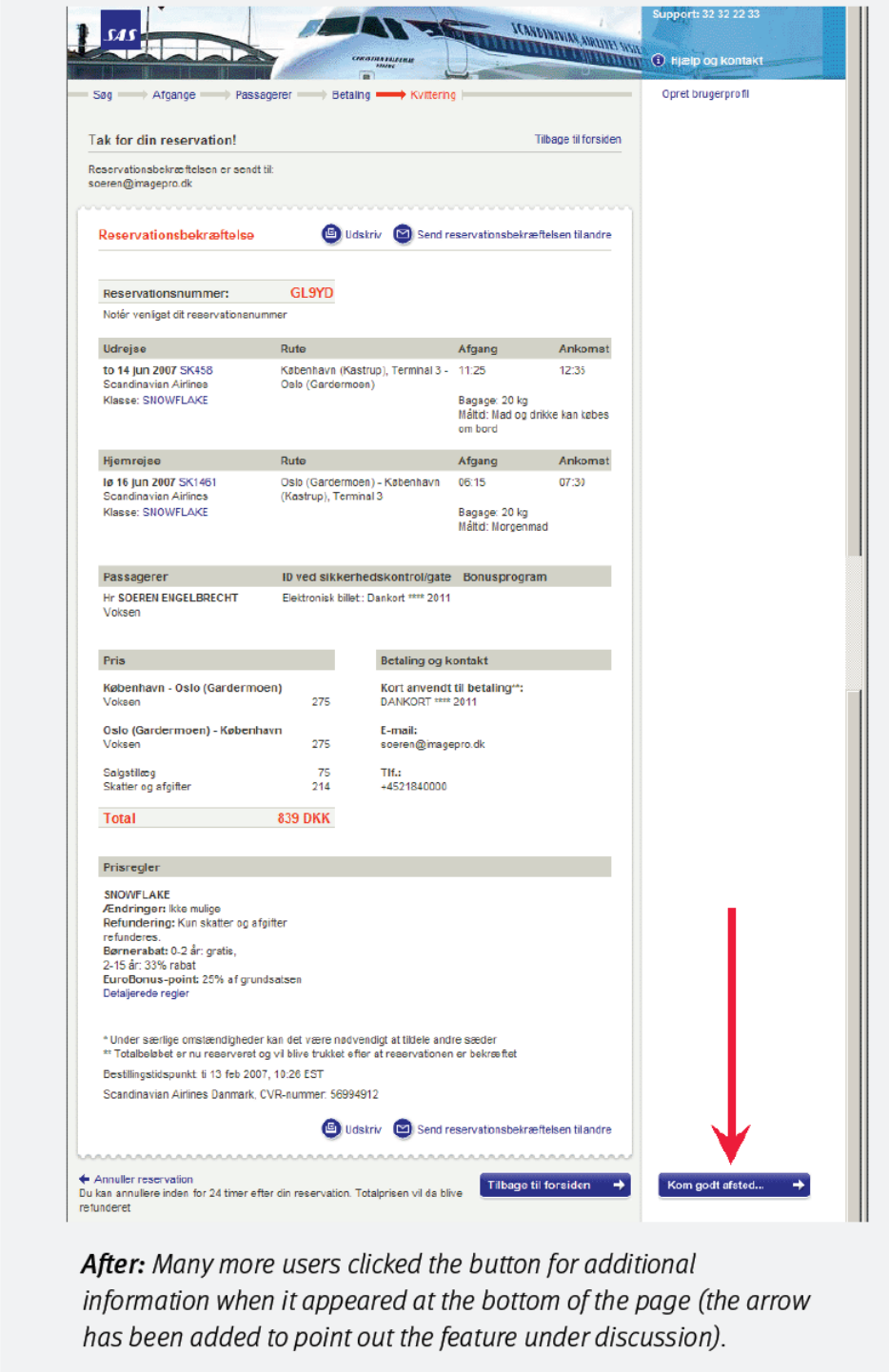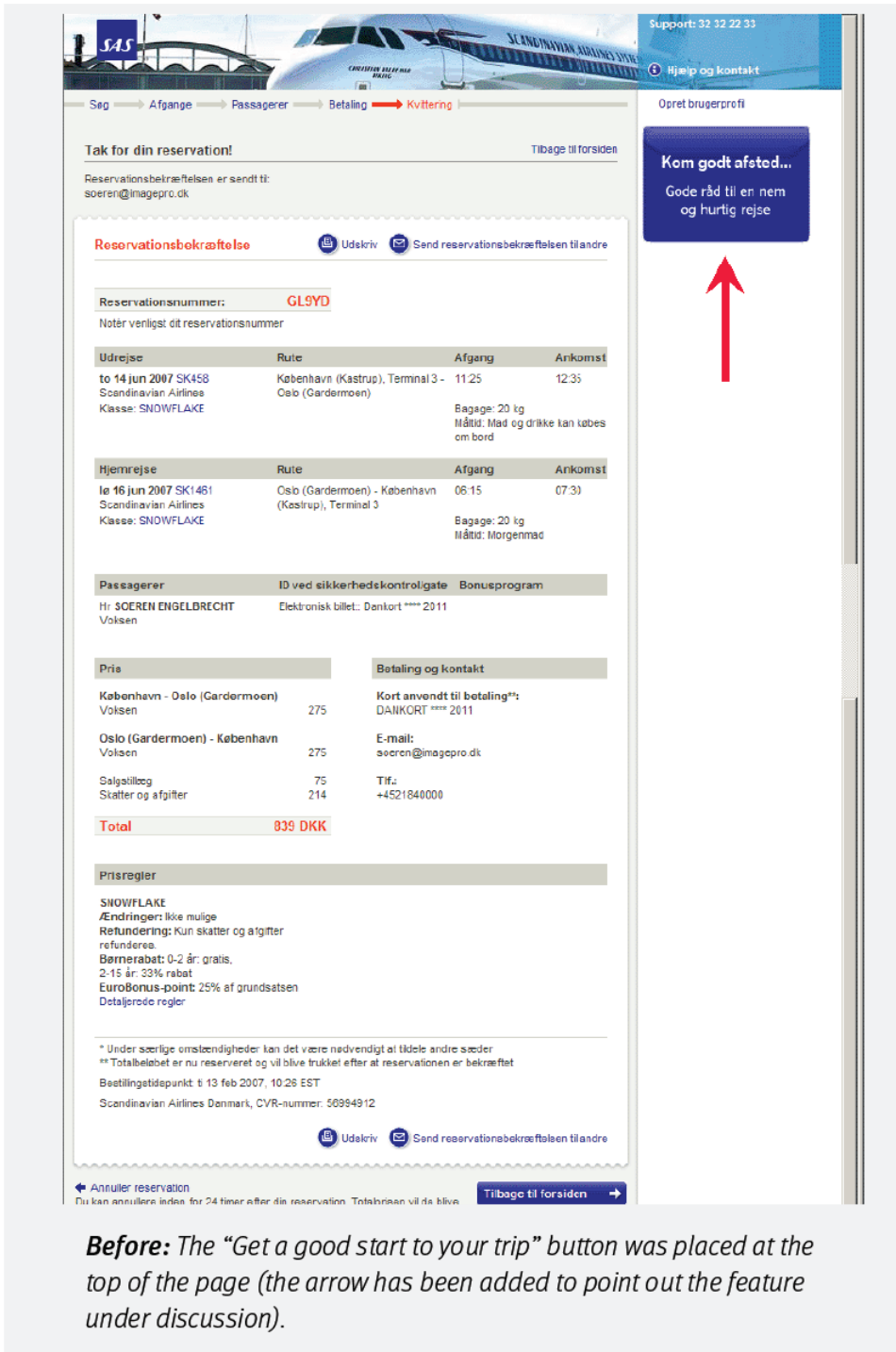 Scandinavian Airlines(SAS)跟大多數航空公司一樣,鼓勵旅客線上訂票。使用者完成預訂後,會進入一個確認頁面,上面列著航班資訊、時間、行李政策等等。頁面右上角,還安插了一個小橫幅按鈕,上面寫著:“為旅程做好準備”。