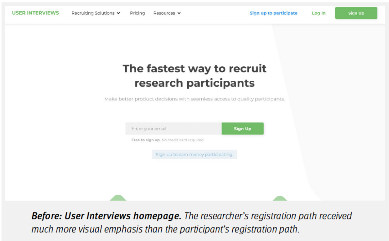 事情要從他們的雙端使用者說起。這個平臺有兩類使用者,一類是研究人員來招人做使用者訪談,另一類是普通參與者來註冊賺點報酬。兩邊的路徑其實完全不同,但他們的老版首頁卻搞得像是隻歡迎研究員一樣。我們看了一眼首頁——中間一塊大大的輸入框和綠色按鈕寫著“招募使用者”,下方還有註冊入口,而參與者那邊的註冊選項呢?小小的灰色字型,躲在下面一個不起眼的角落裡,寫著“註冊賺點零花錢”……那你說一個路人甲第一次進來,十有八九就點錯了吧?